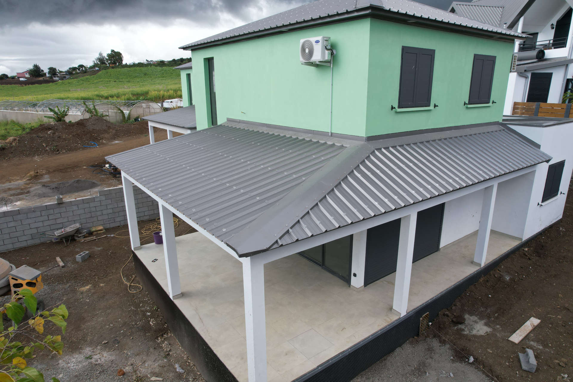 Terrasse couverte extérieur attenant à une cuisine équipée et aménagée.