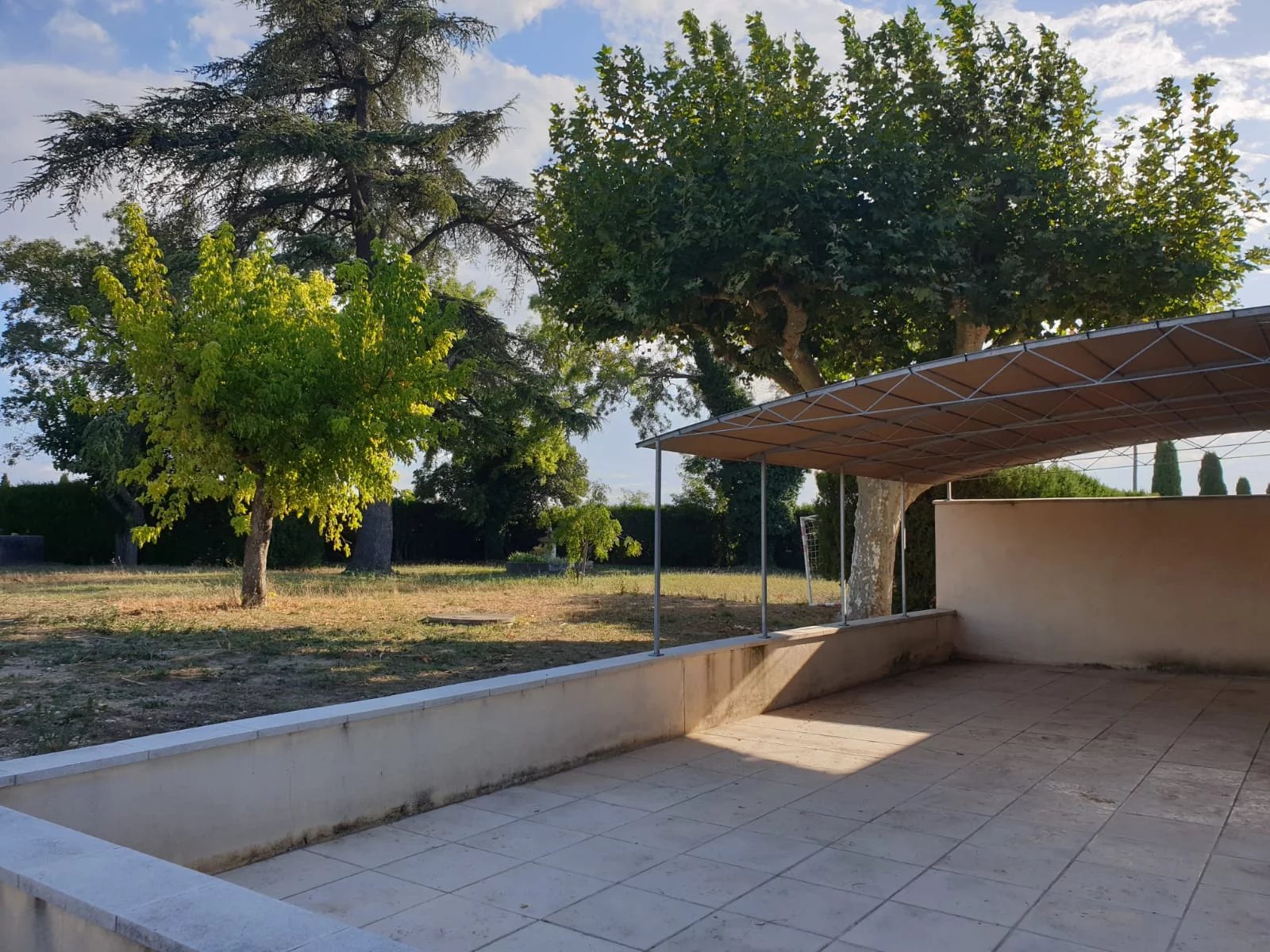 Grande terrasse couverte par toile tendue, sur un terrain arboré de 1000 m², non clos avec bassin a...