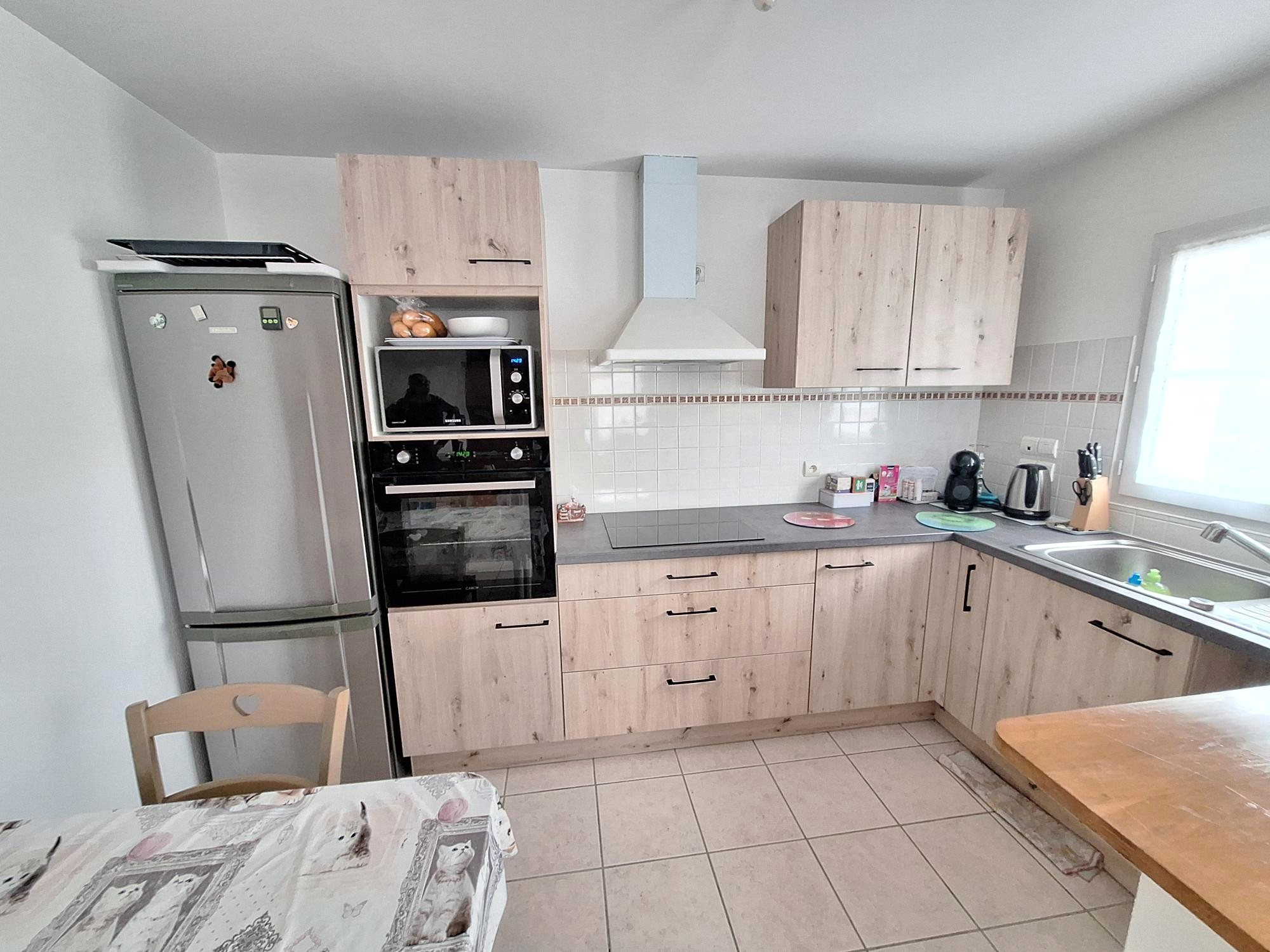 A louer de suite, maison récente comprenant un séjour-salon avec espace cuisine aménagée (plaque cuisson, four et hotte), un cellier.