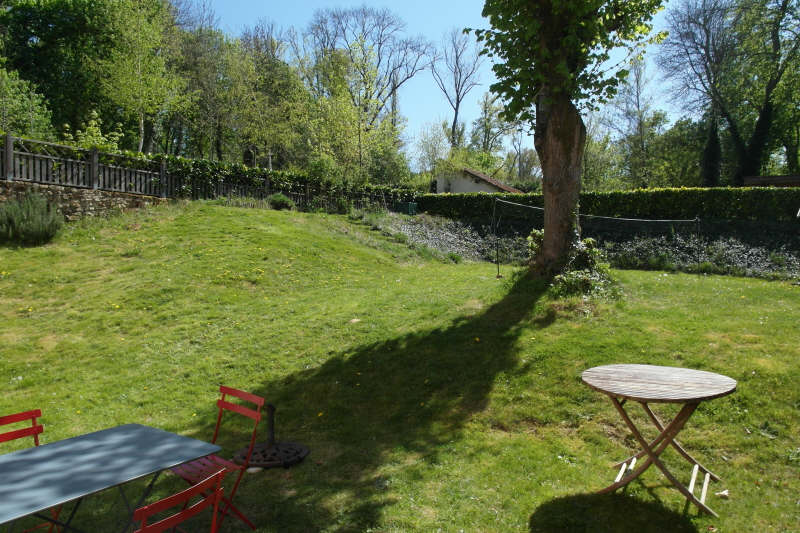 Sur un beau terrain arboré au calme, centre-village à pied, maison comprenant une entrée, un salon + un séjour, une cuisine aménagée, une chambre, une salle d'eau, un wc.