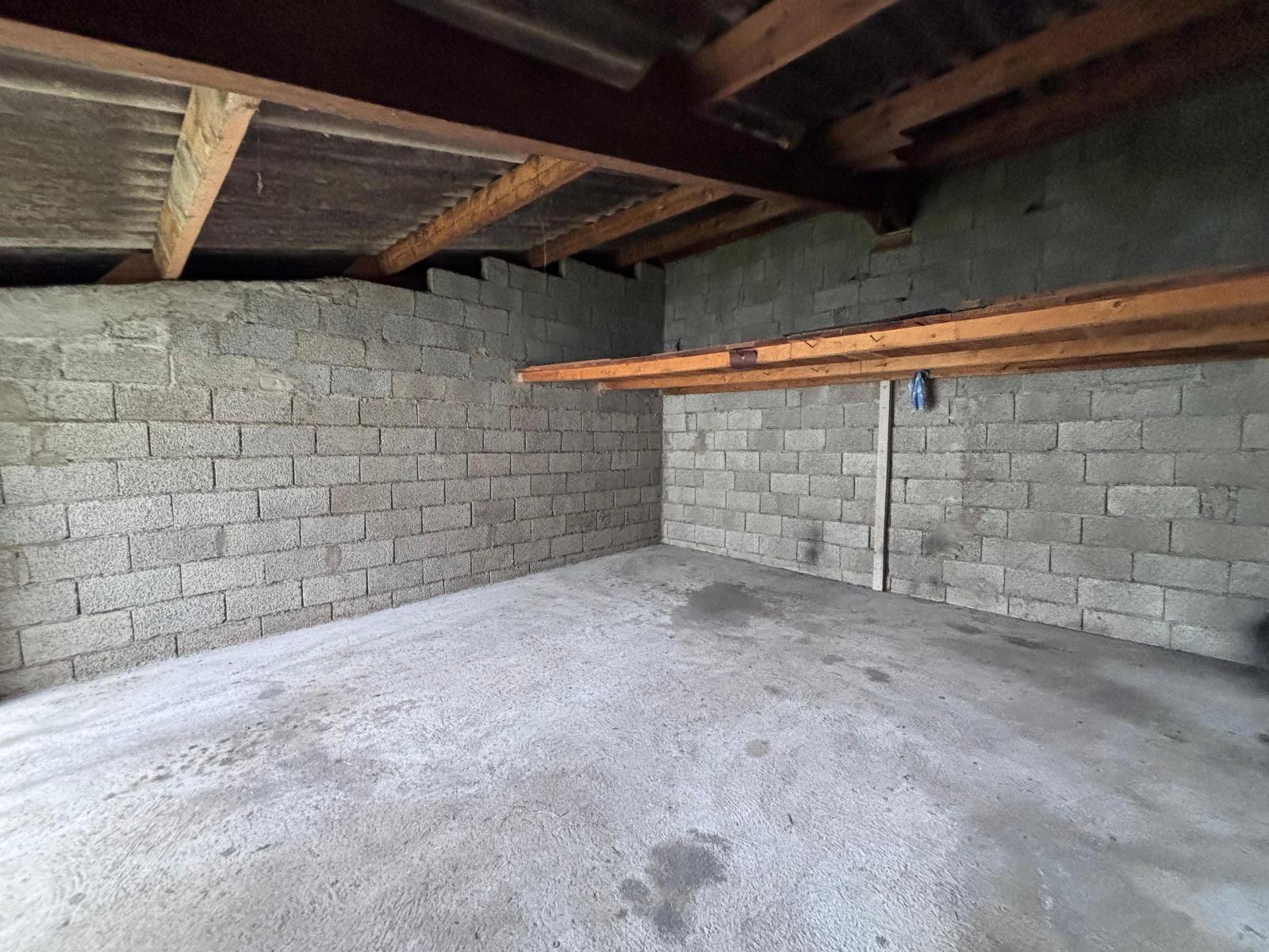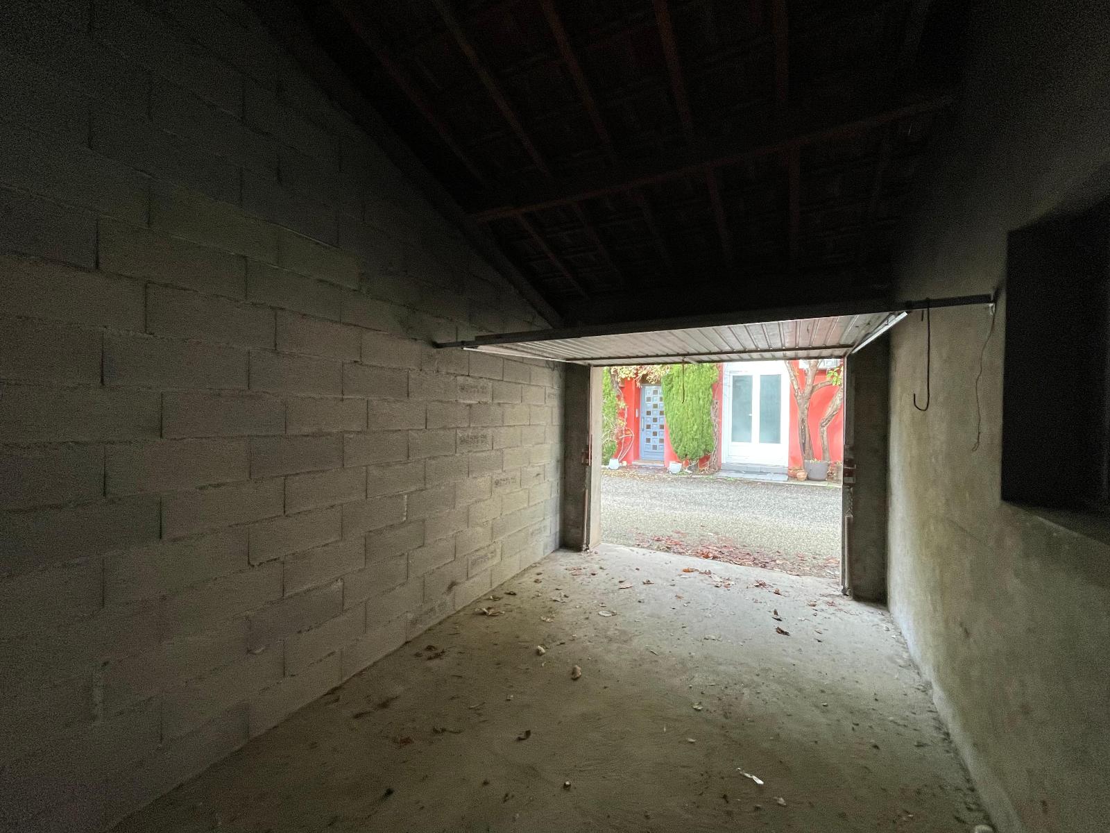Garage d'environ 15 m² avec porte basculante manuelle.