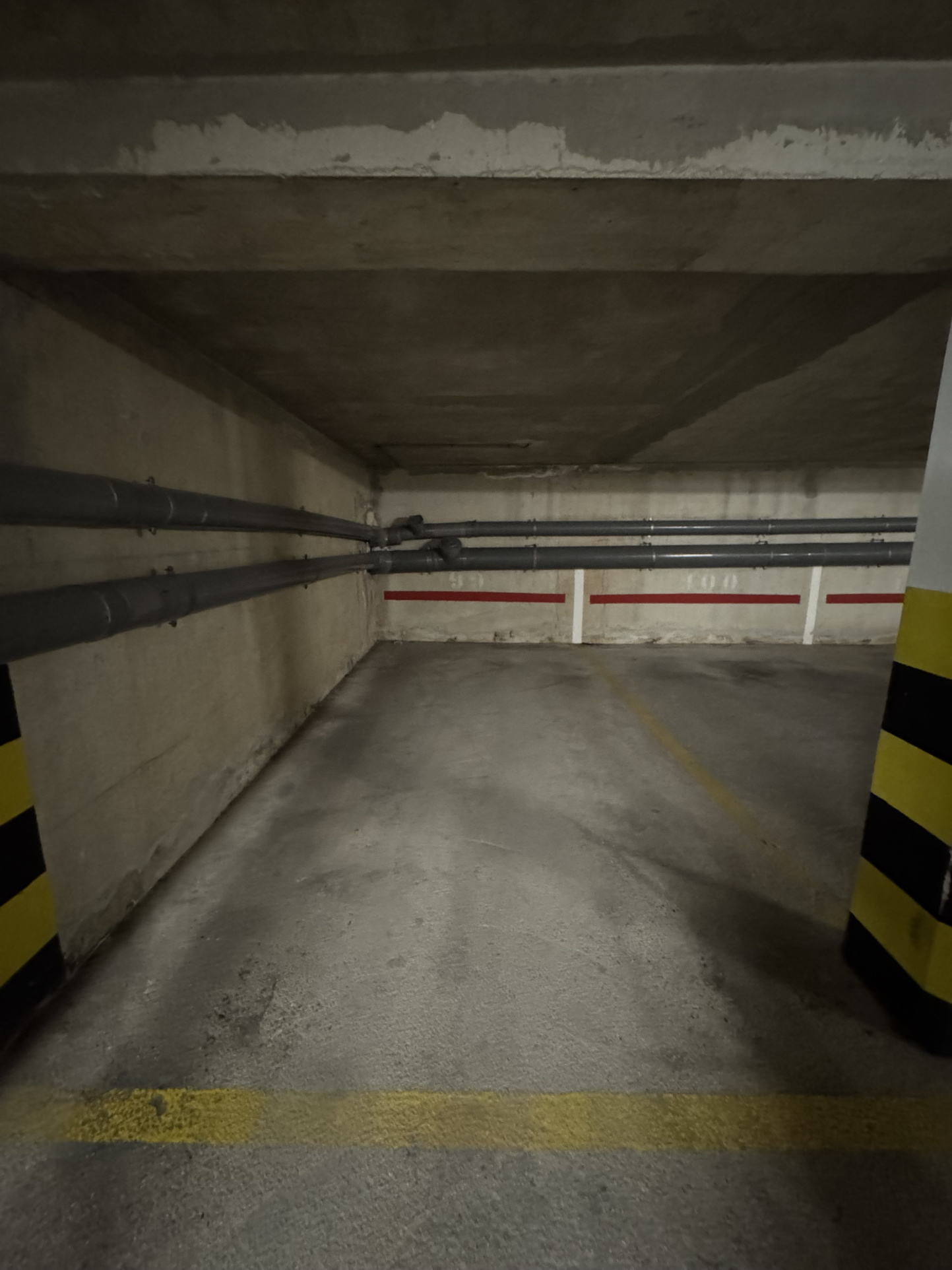 Place de stationnement dans un parking couvert avec porte automatique.