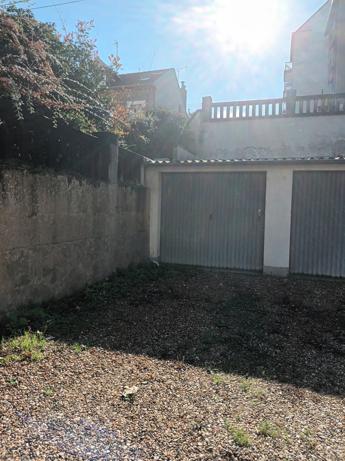Garage dans cour sécurisée avec étagères/rangements.