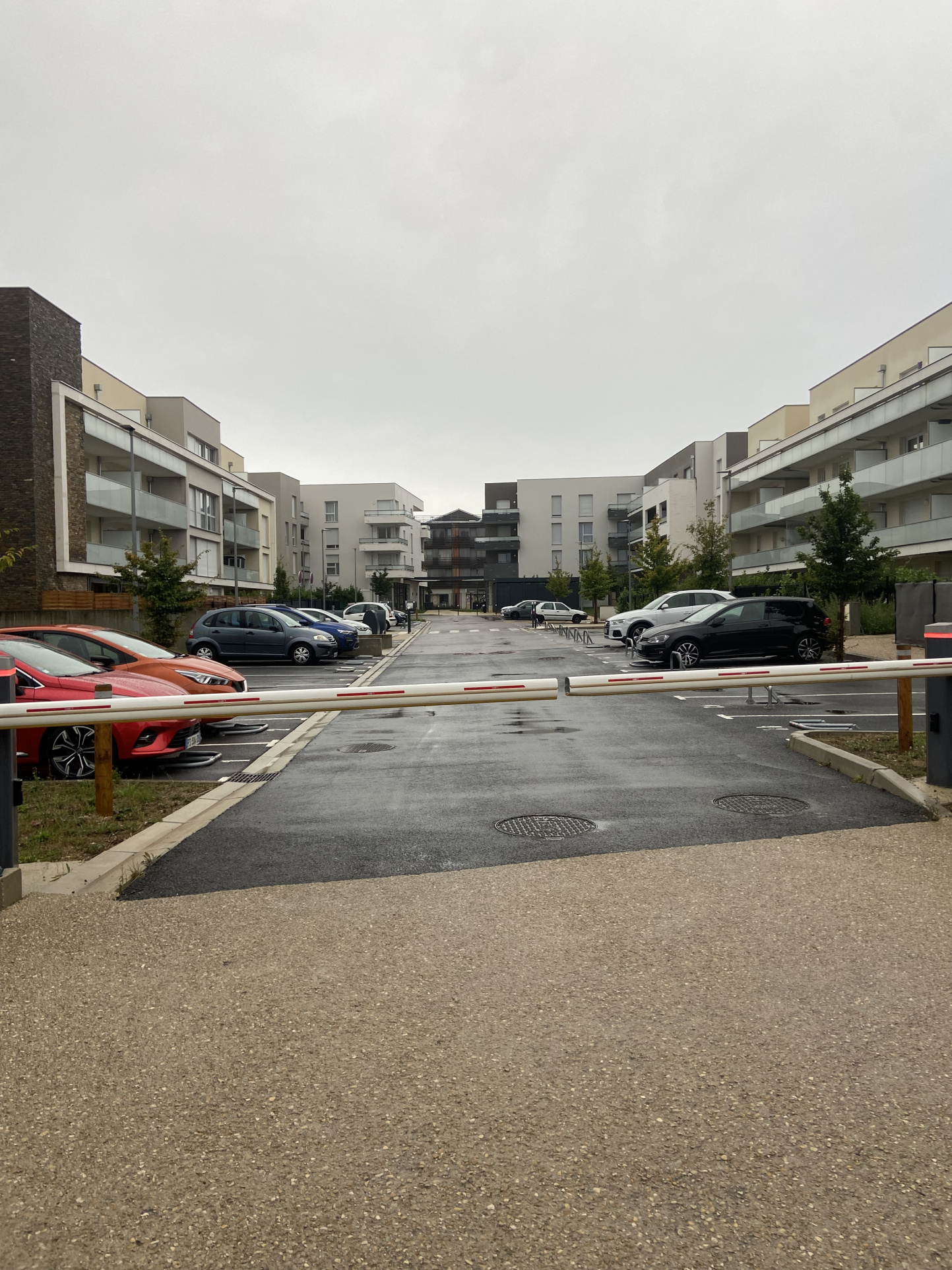 Emplacements de parkings extérieurs dans une résidence sécurisée, avec porte automatique.