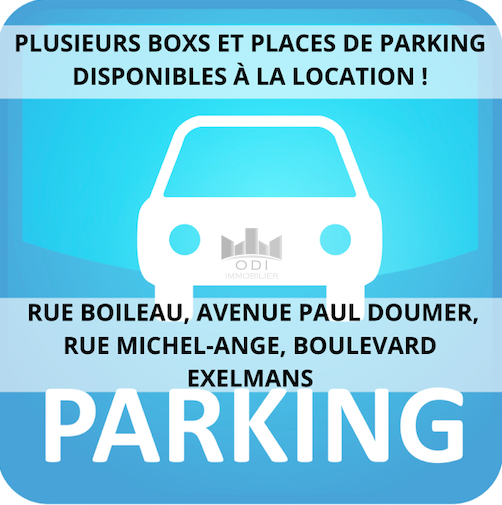 ODI IMMOBILIER vous propose à la location plusieurs emplacements de stationnement et des boxs, rue Boileau, avenue Paul Doumer, rue Michel-Ange, boulevard Exelmans.. Entre 150 EUR et 198EUR