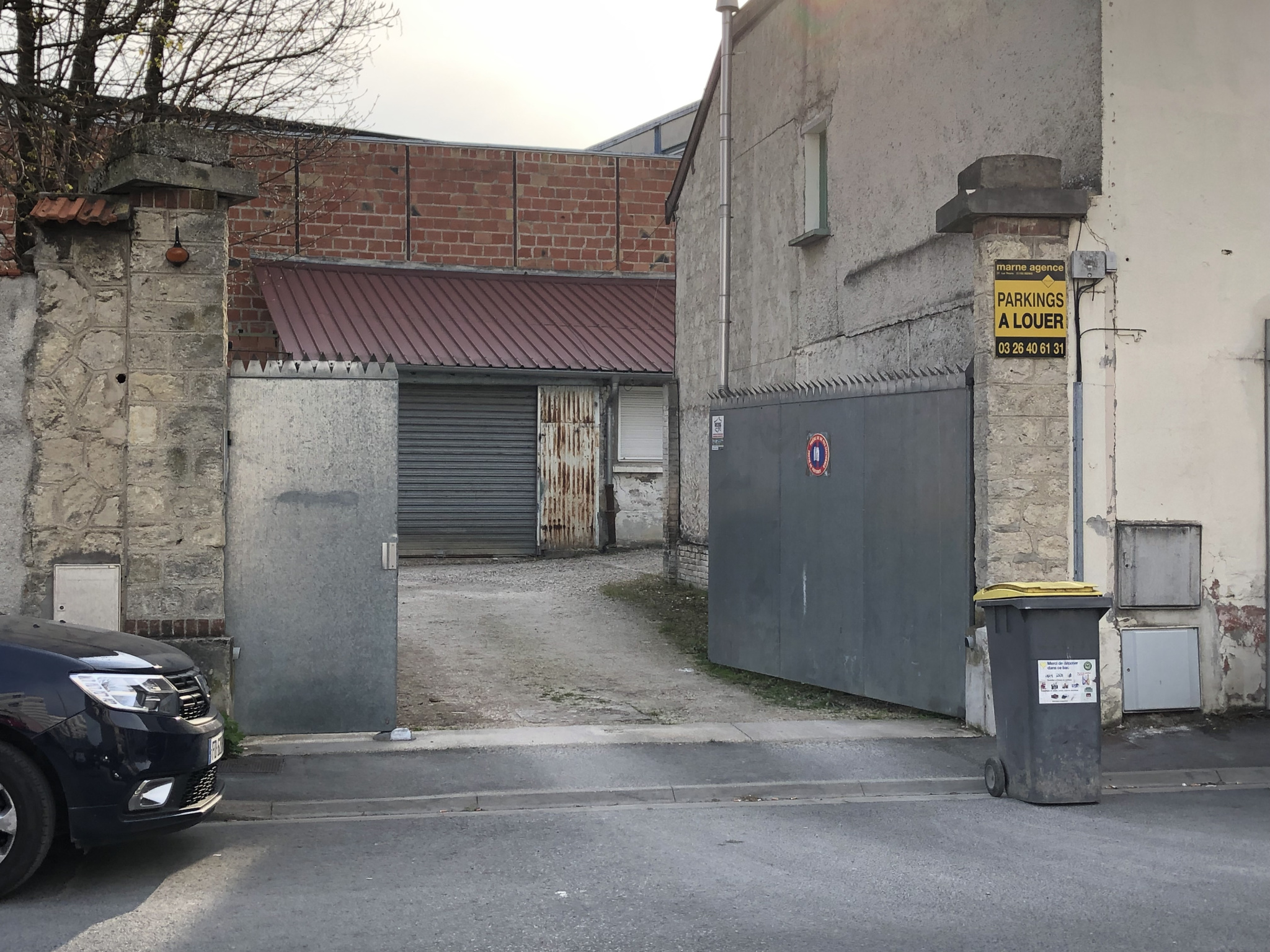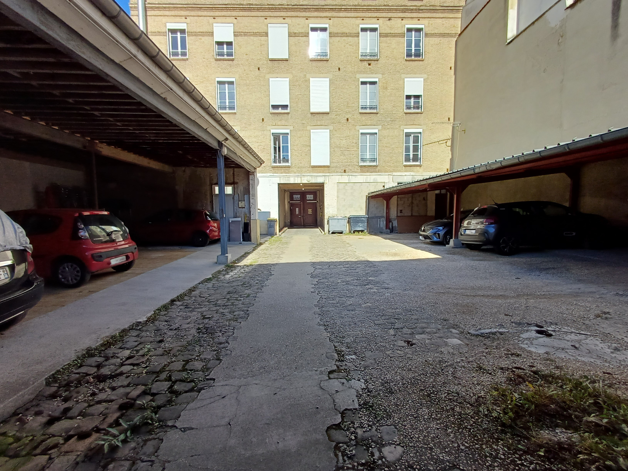 Emplacement de parking dans une cour fermée par une porte automatique -