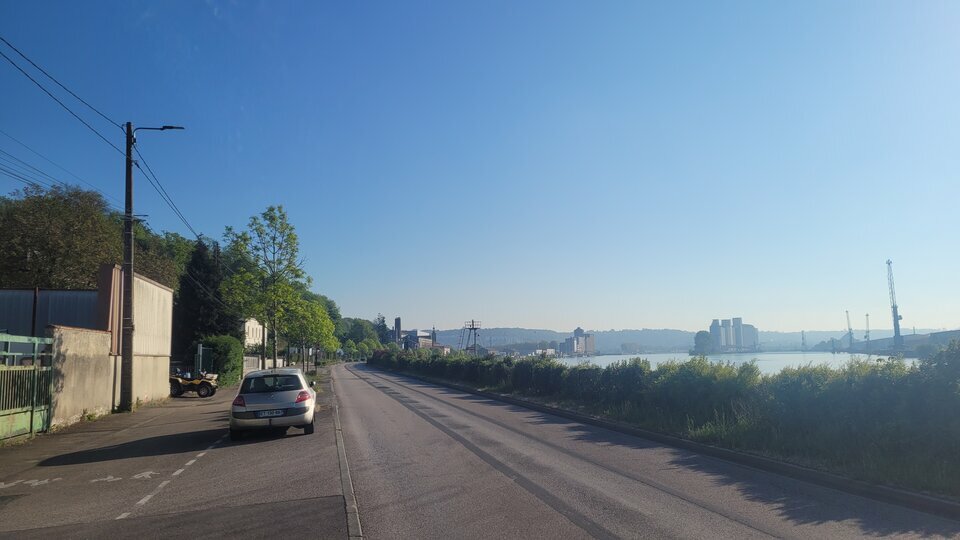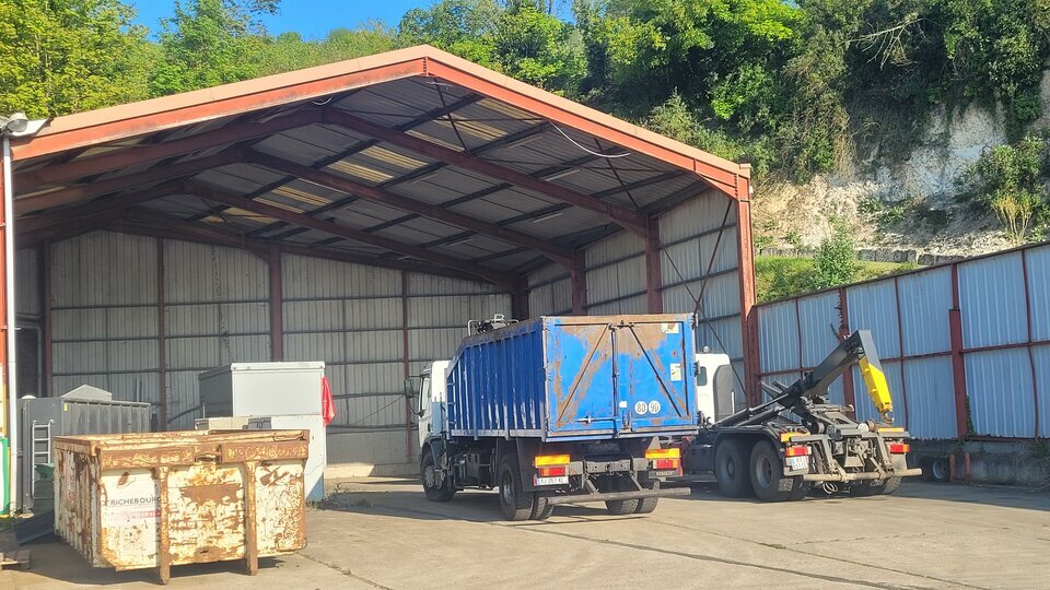 Proche Rouen, un terrain de 749 m², bétonné et bitumé, avec un auvent d'environ 200 m², construit en soubassement béton sur 1,80 m + bardage simple peau, charpente métallique et toiture bac acier.* Hauteur sous auvent : de 7,20 à 9,50 m.
