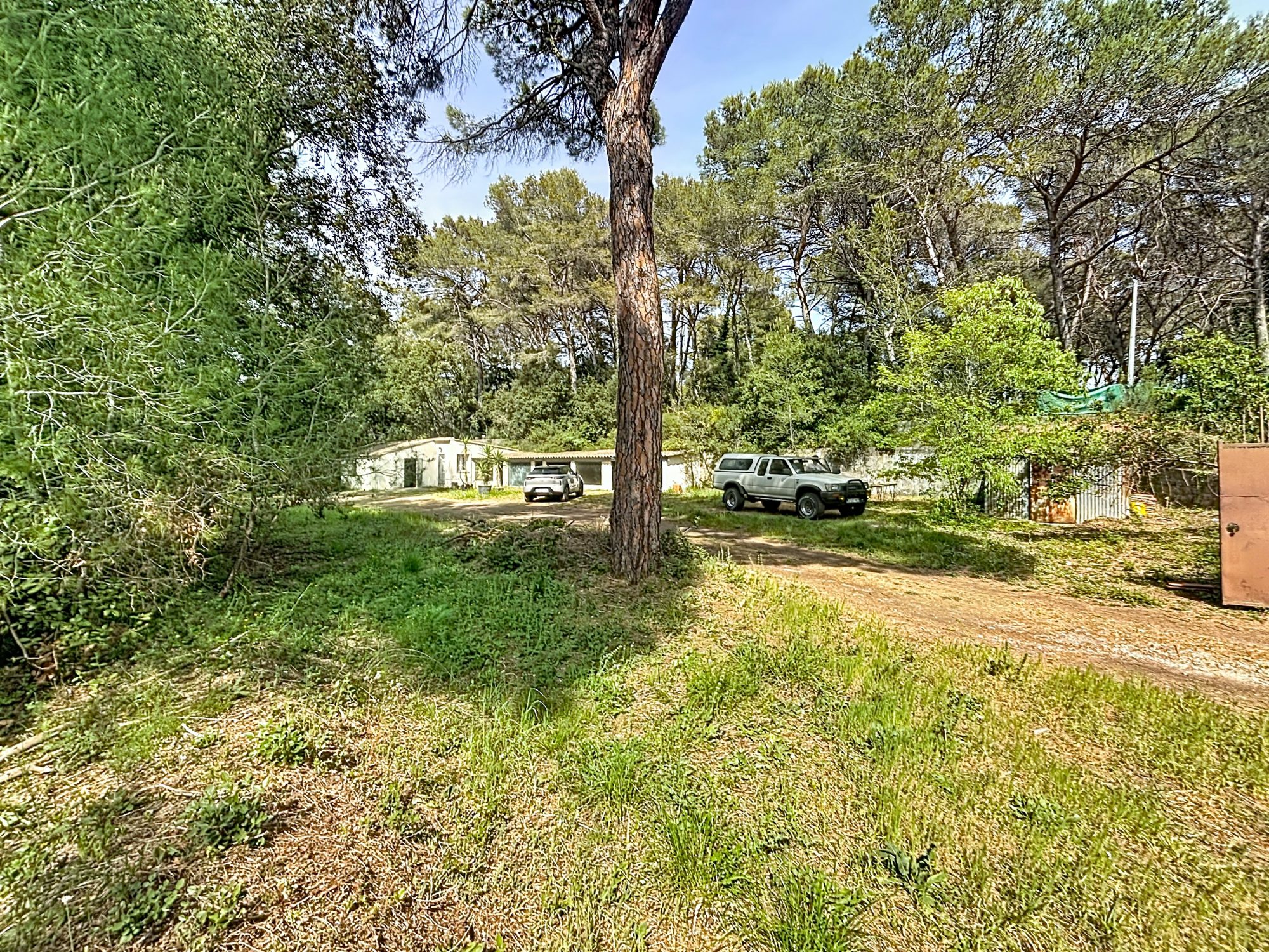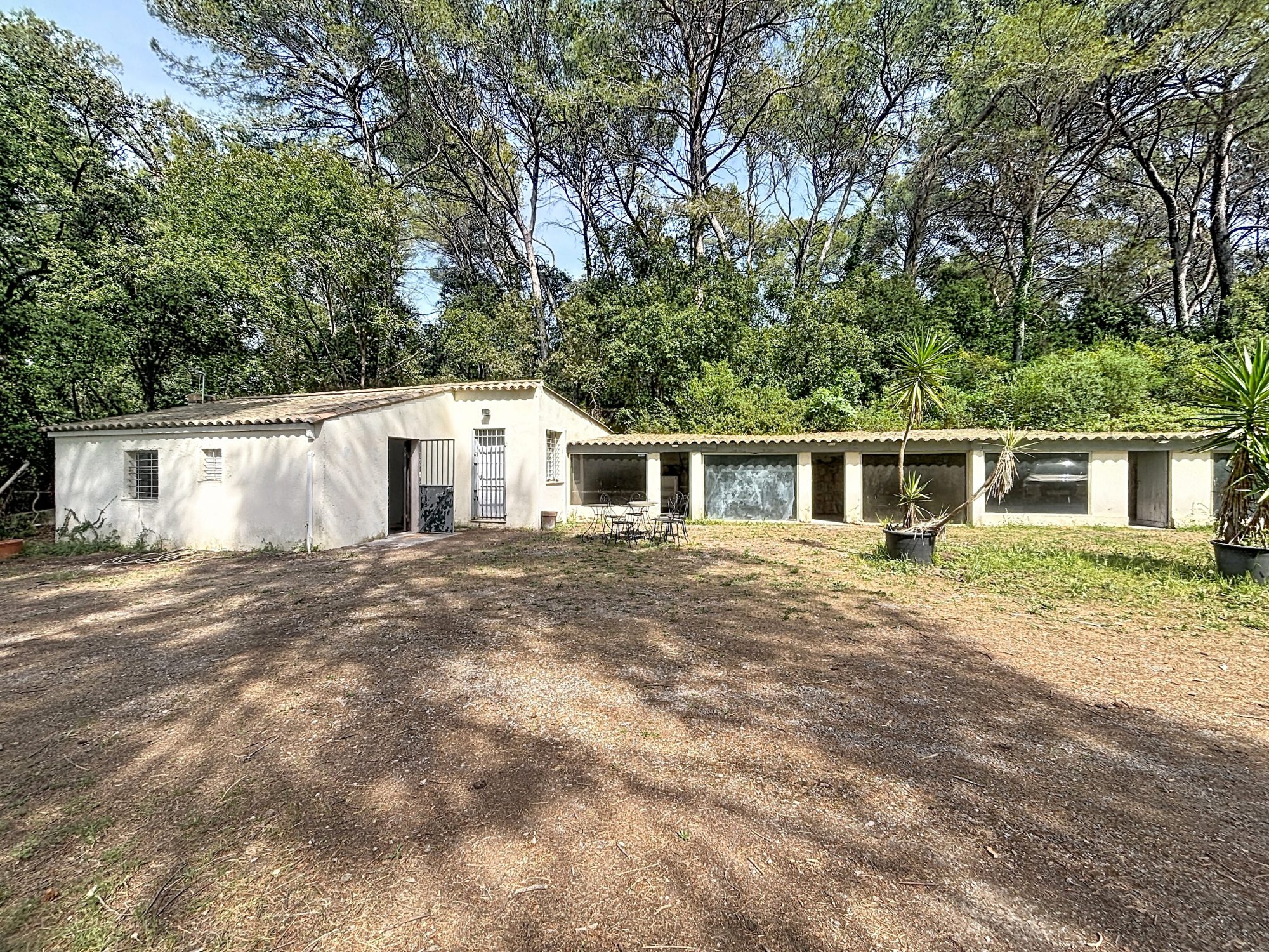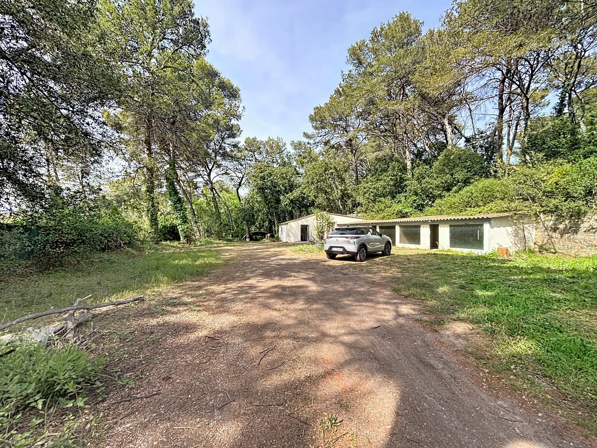 Mougins, quartier du Miracle, terrain de stockage clos à louer d'une surface de 1943m² avec un bureau en dur et plusieurs cabanons de stockage.