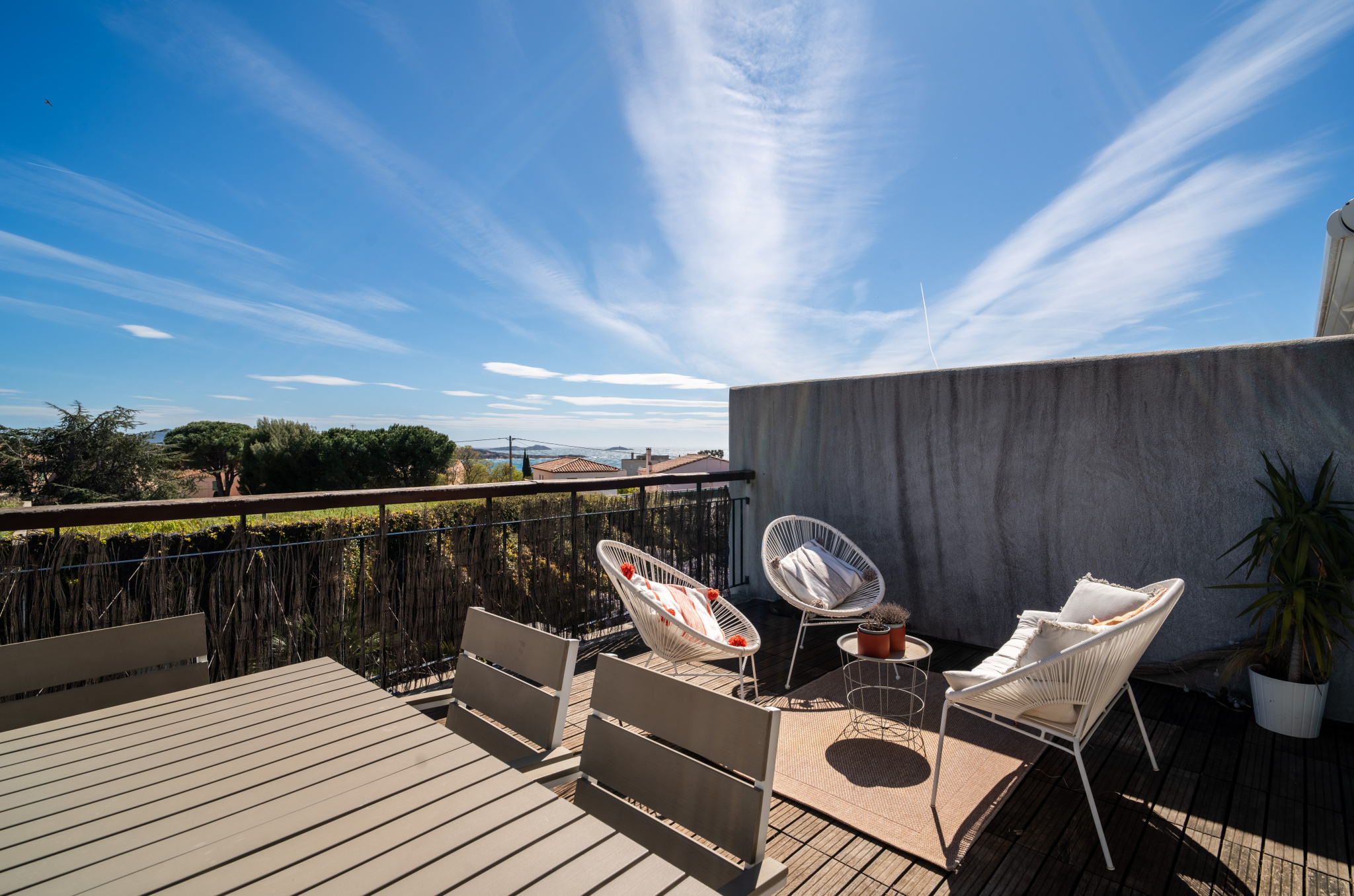 Au coeur de Bandol, dans une résidence contemporaine sécurisée à deux pas des plages et du centre, découvrez ce T5 en attique de 137 m2 habitables, véritable villa sur le toit.