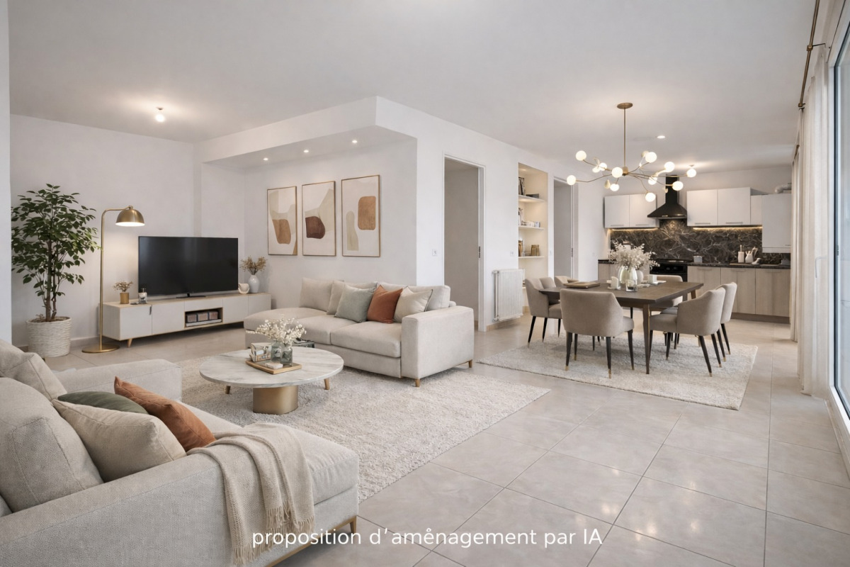 Une vaste pièce de vie lumineuse de 32 m² avec cuisine ouverte aménagé...