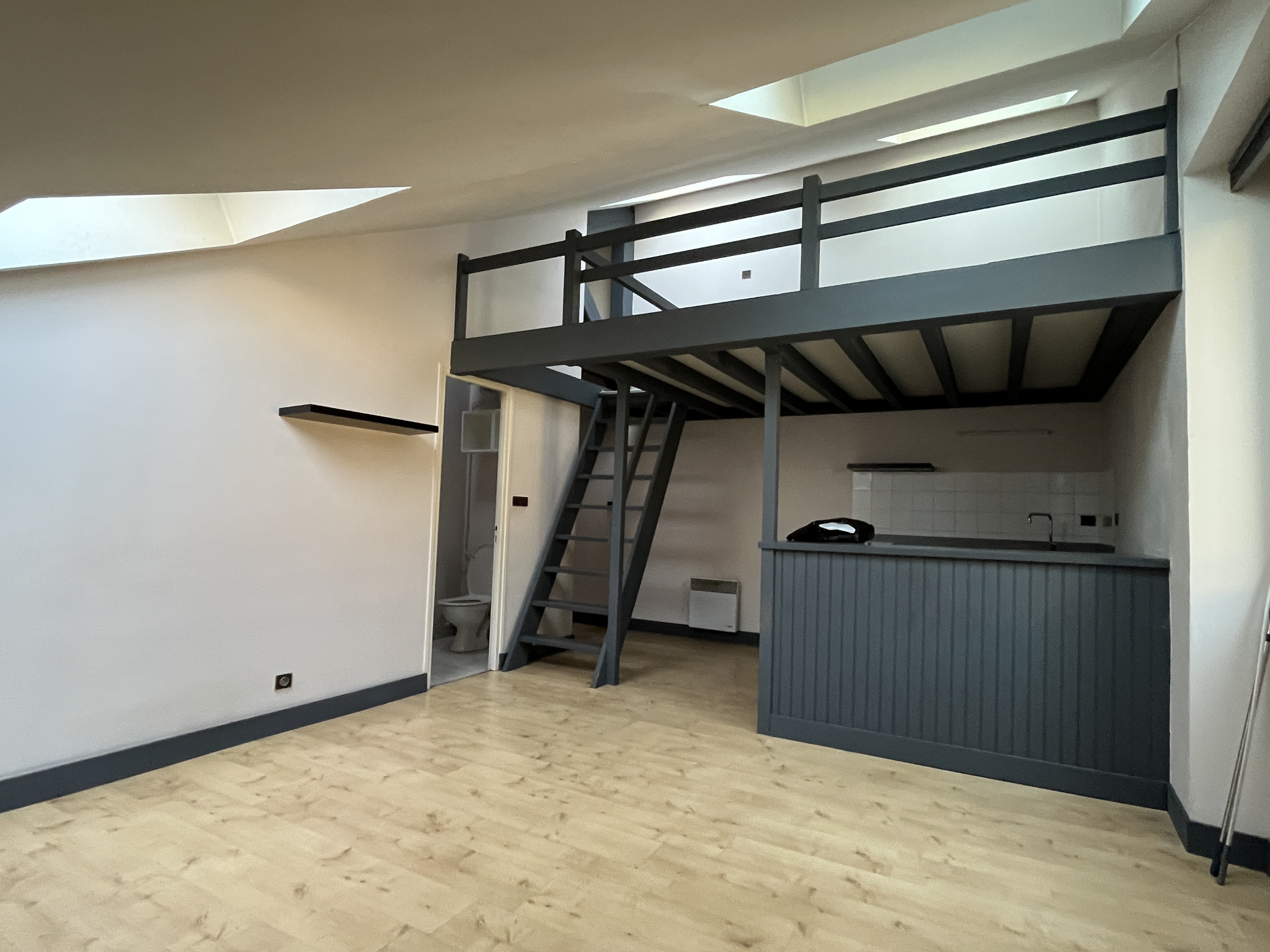 Actuellement loué, il comprend une grande pièce mansardée avec jolie cuisine équipée