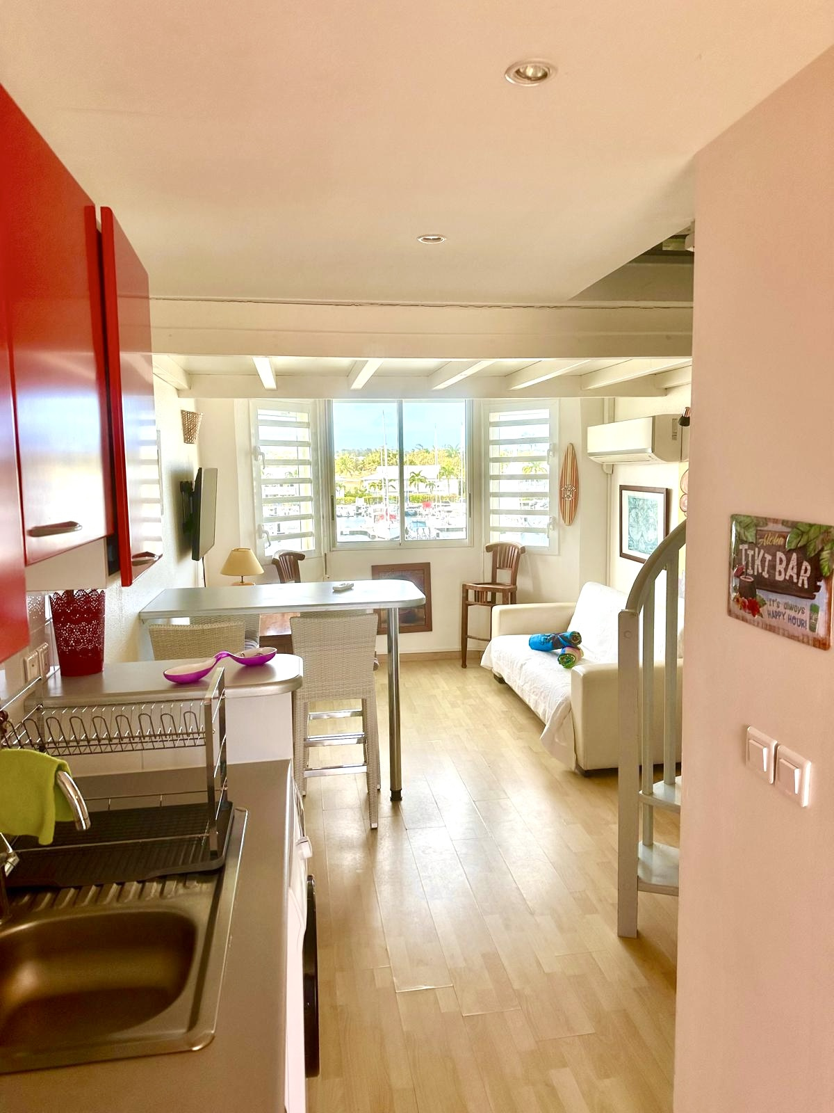 Entrée sur salon, chambre en mezzanine, salle de bains avec WC, climatisation, terrass...