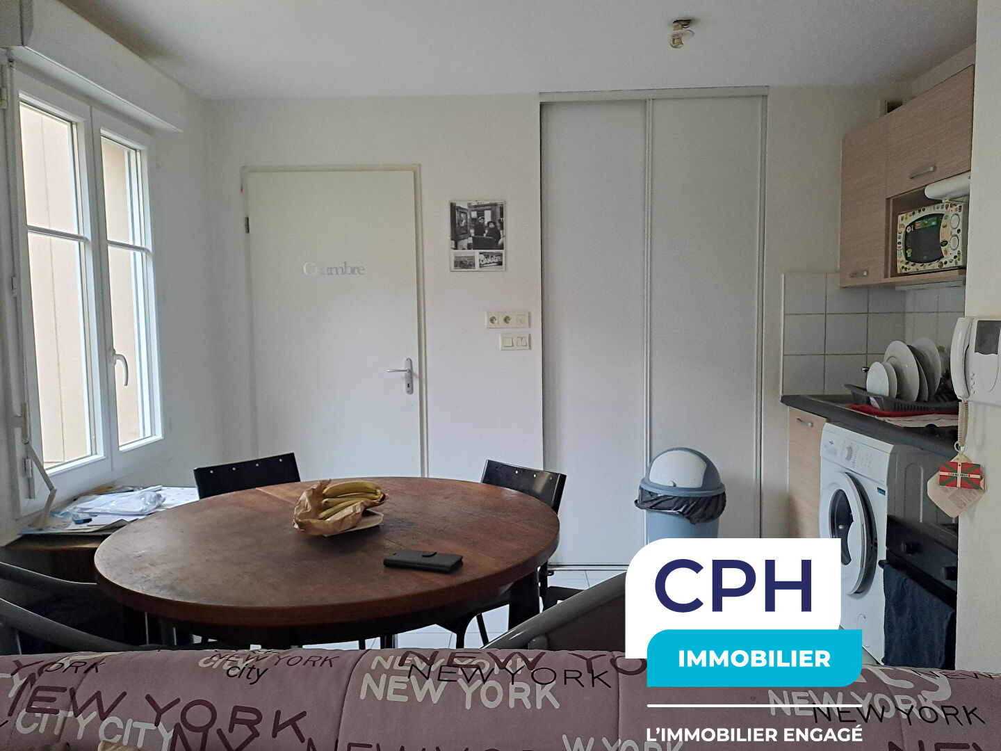 Une entrée, un grand séjour, une cuisine semi-équipée (plaques de cuisson, lav...