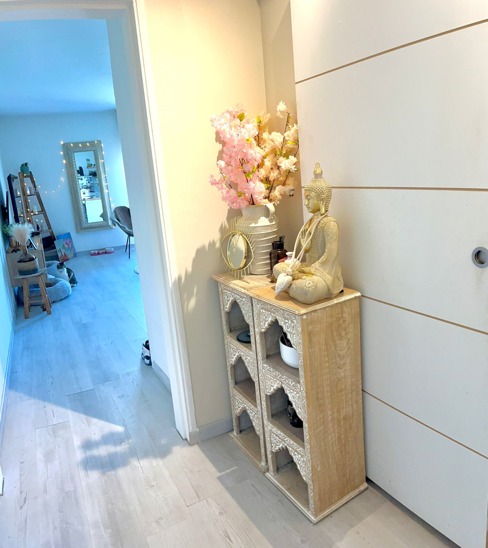 Une entrée déservant un salon/séjour avec cuisine ouverte, deux chambres, une salle d...