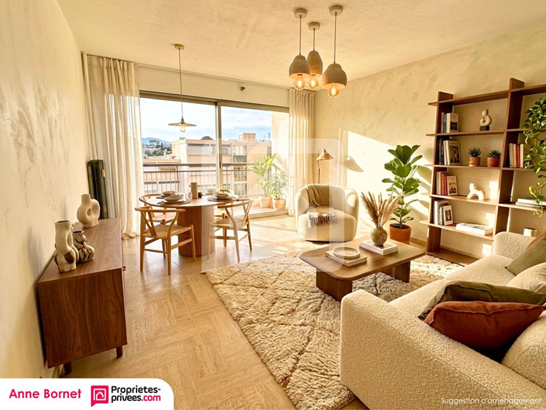 EXCLUSIVITE ! Rue de Cannes/Cannet Mairie, proximité directe tous commerces et commodités dans petite résidence sécurisée très bien tenue, charmant et lumineux 3/4P entièrement rénové et très bien agencé avec triple exposition Sud/Ouest/Nord : Séjour avec cuis...