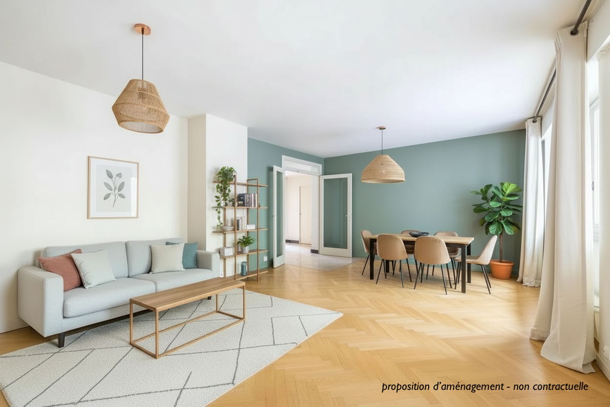Proche place Bir-Hakeim, situé au 1er étage d’un immeuble ancien, ce bel appartement traversant de 90 m² séduit par ses beaux volumes, son cachet et sa luminosité.