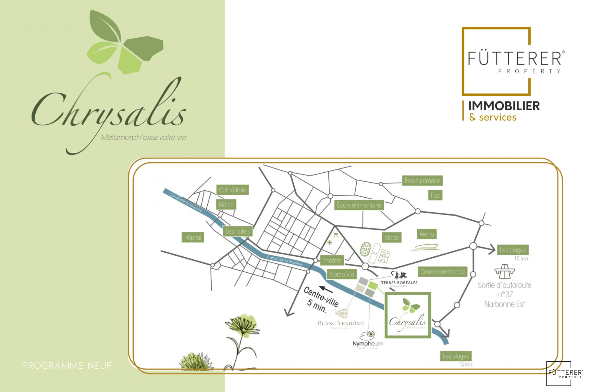 Fütterer Property vous présente: Situé dans le quartier 'LES BERGES DE LA ROBINE', proche canal de la Robine, au sein de la nouvelle résidence Chrysalis, conforme à la norme RE2020, proche du centre historique, entre nature et modernité, appartement ...