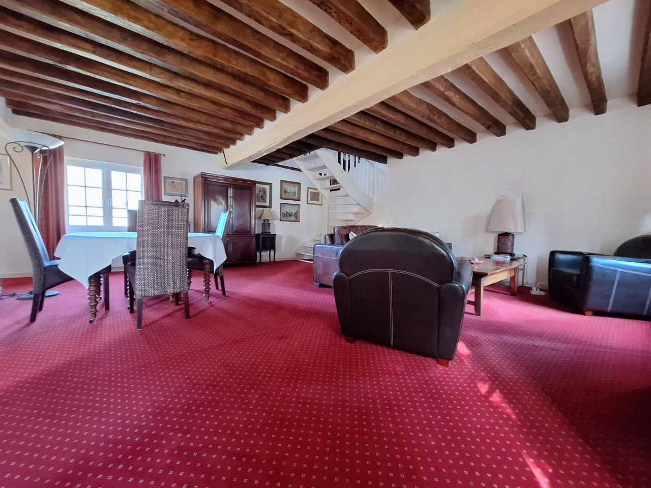 Dès l'entrée, le charme opère : parquet ancien, poutres apparentes, cheminée, tomettes et belle luminosité grâce à un...