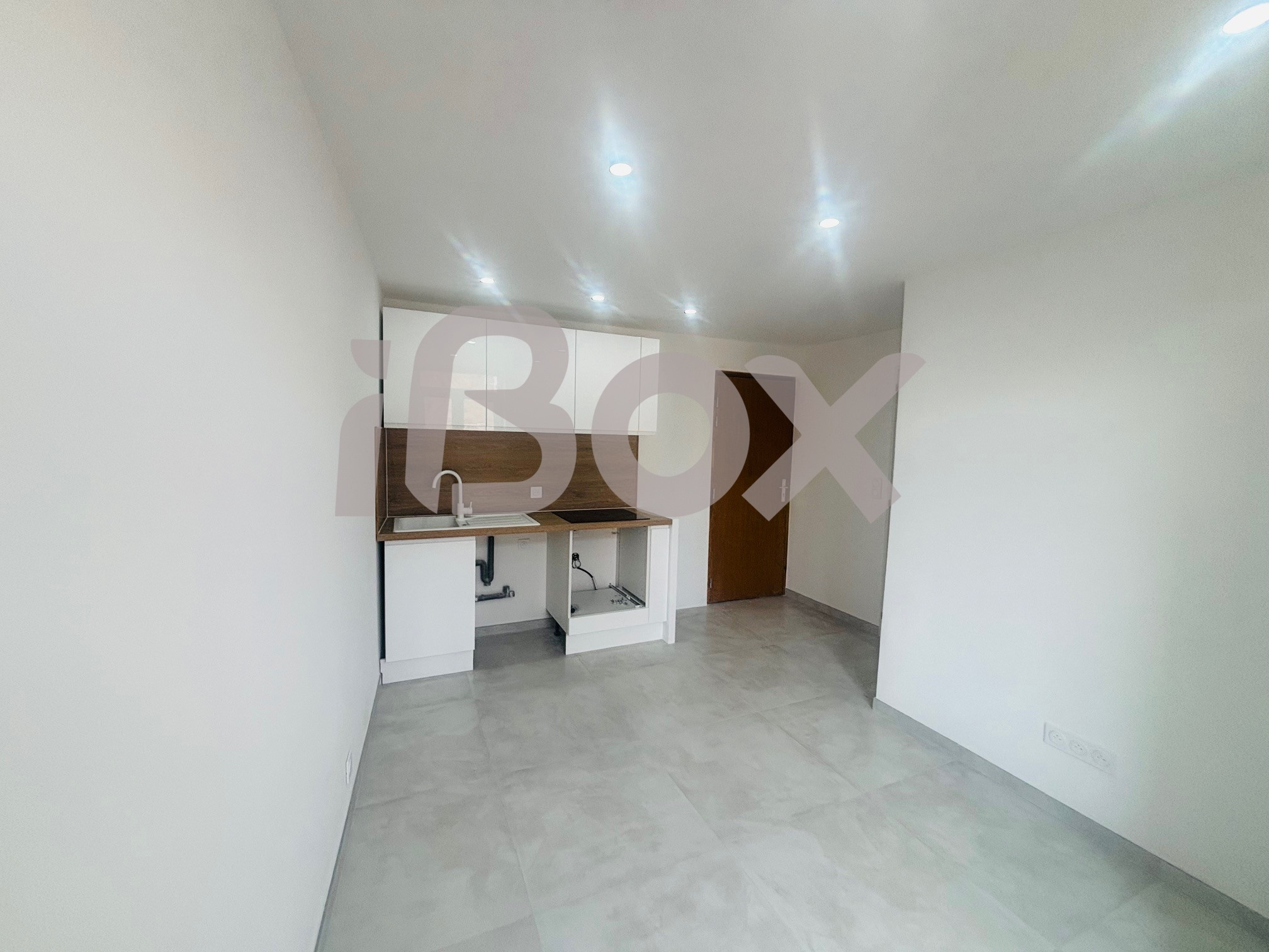 Entrée sur espace à vivre avec cuisine US aménagée et semi équipée, coin nuit, salle d'eau, WC suspendus.
