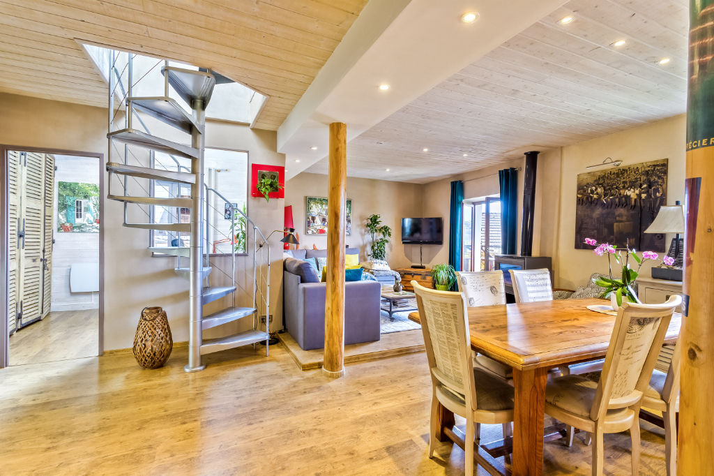 Parquets massifs, carreaux de ciment, escalier bois avec sa rambarde métal et hauteurs sous plafond de plus de 3M.