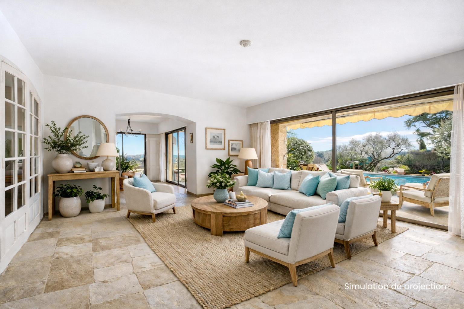 Séjour donnant sur une splendide piscine traditionnelle, 1 chambres avec salle d'eau et wc, et un bureau de plain pied