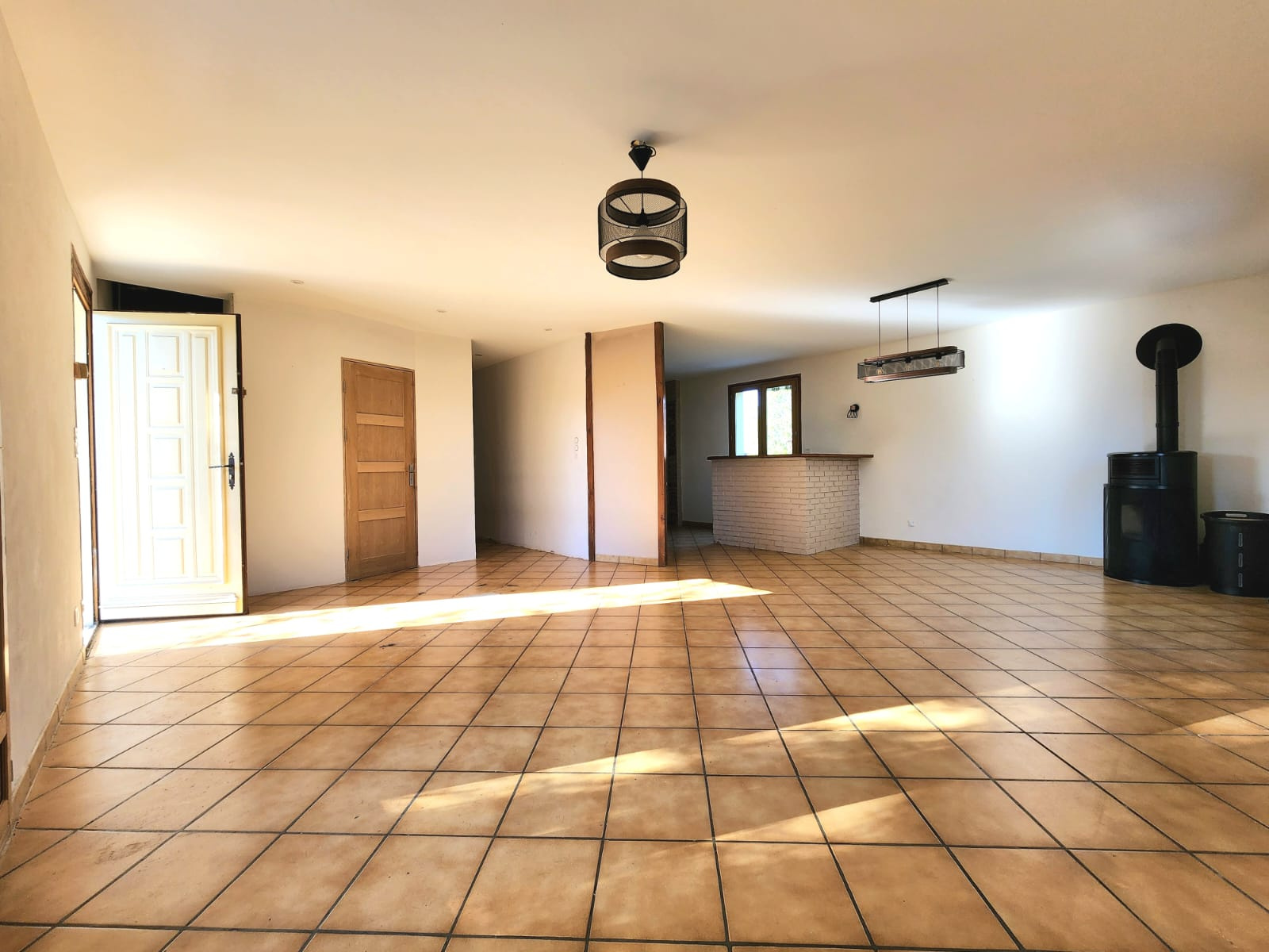Une entrée, pièce de vie lumineuse équipée d'un poêle à granulés, cuisine équipée, un WC.