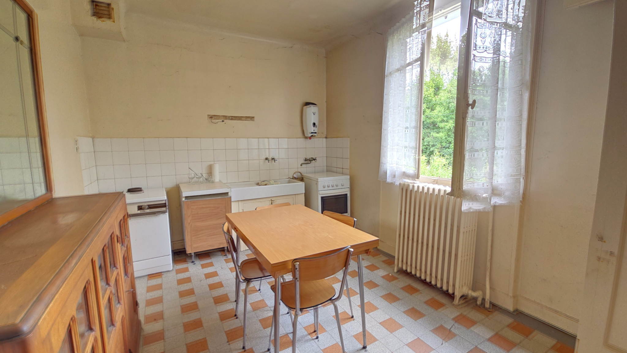 La première partie maison de 60 m2 à rafraichir dans sa totalité, entrée, cuisine, 2 chambres, salle à manger, salle d'eau. comble à aménager.