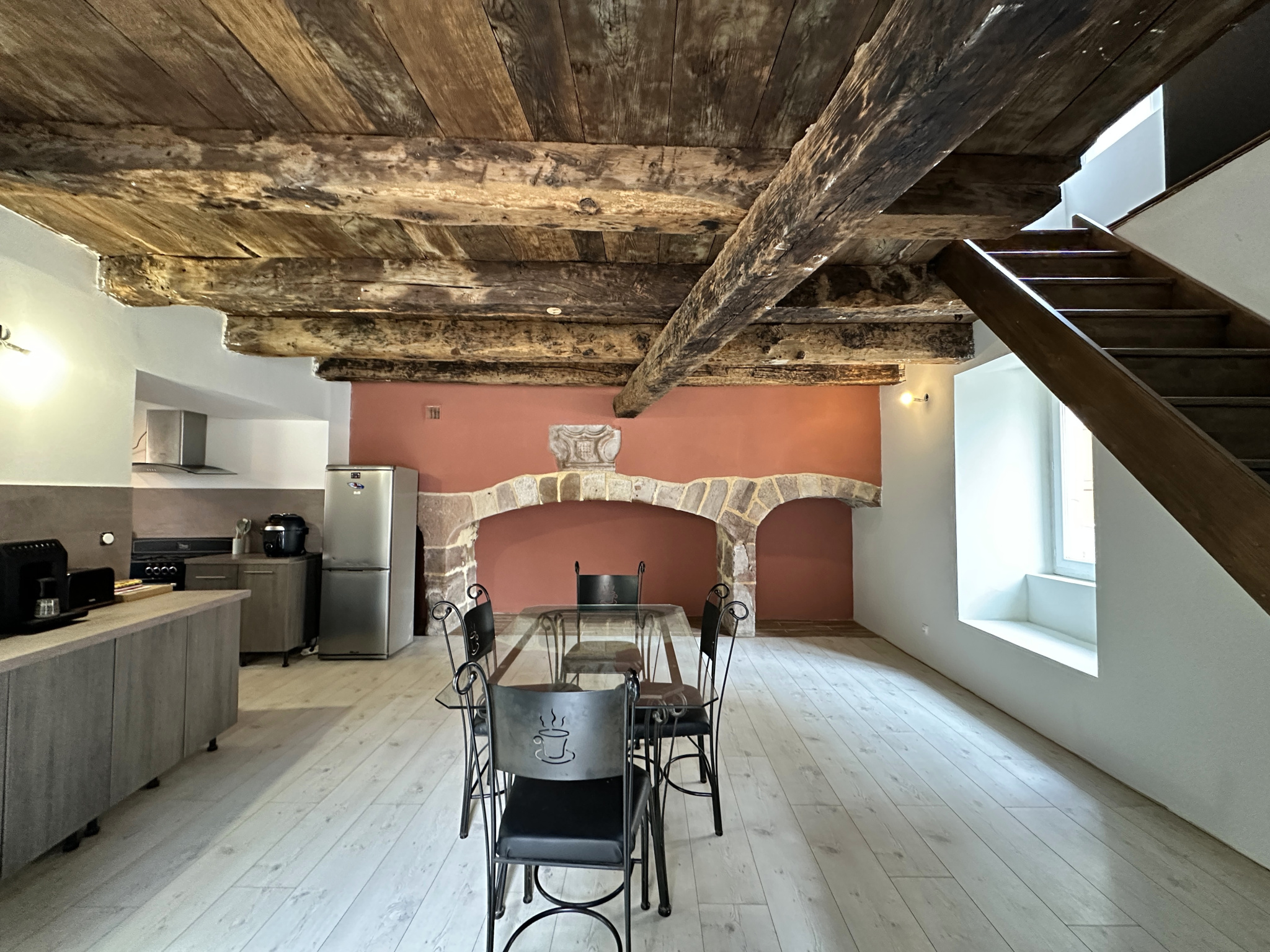 - Etage : env 30 m² dont séjour avec cheminée ouverte + partie cuisine, Wc (cloisons bois)