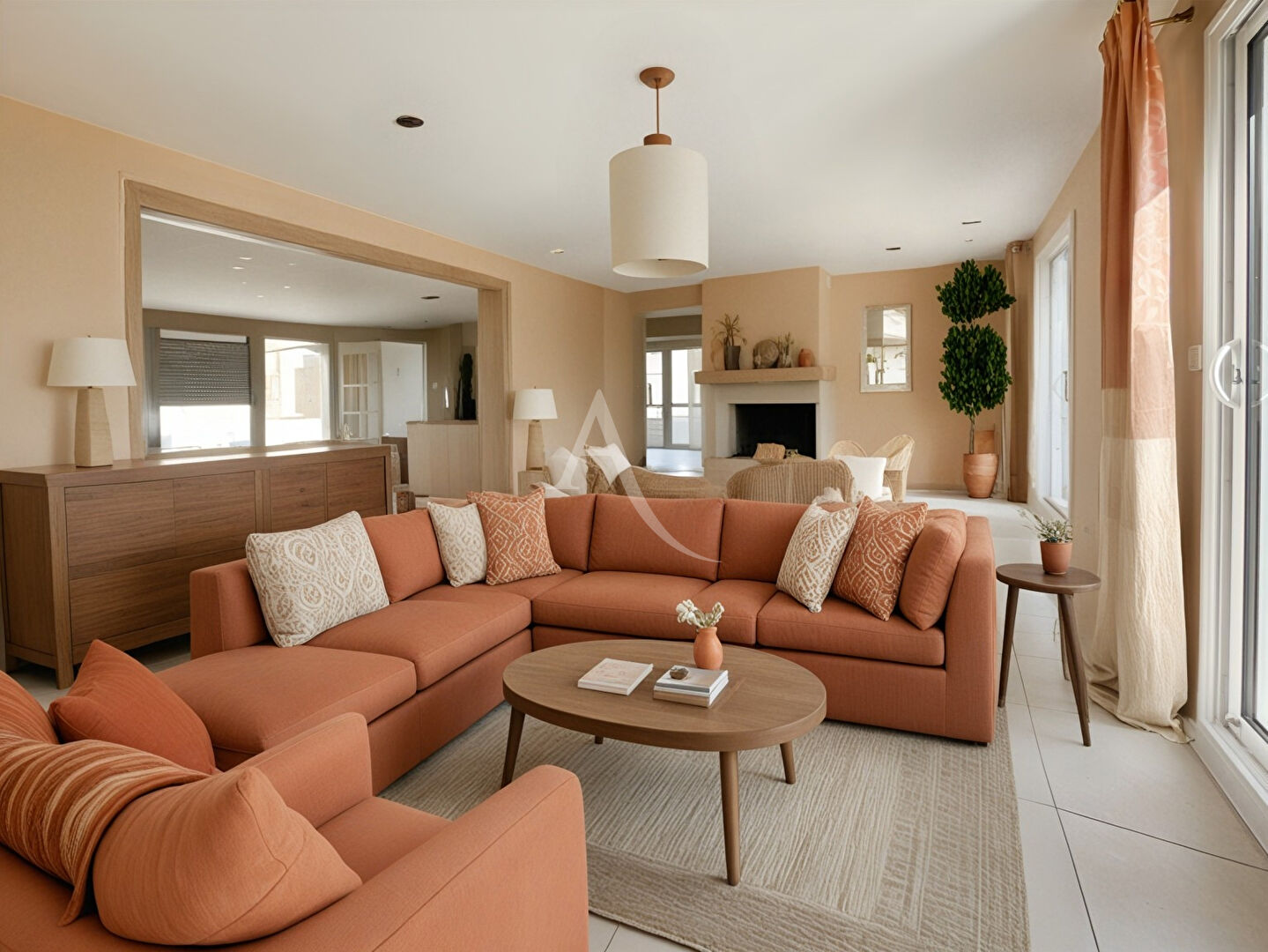 Un vaste séjour de 65 m² avec un insert s'ouvre...