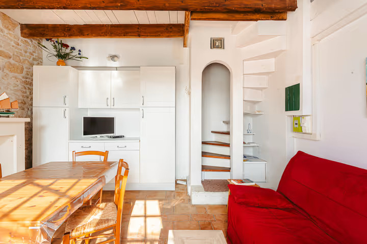 Maison ancienne composée d'une entrée, une cuisine équipée, une salle d'eau avec wc, un petit salon avec poêle à granulés, un grand séjour.