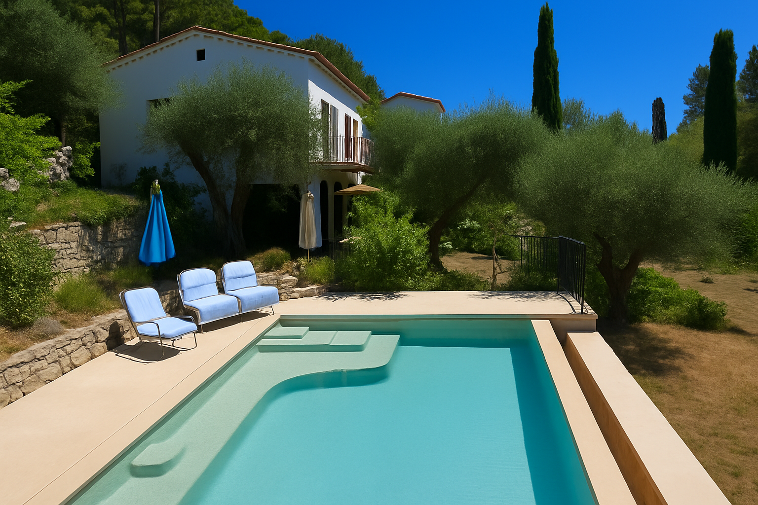Cette villa de 195 m² bénéficie d'une des vues les plus spectaculaires des collines derrière Valbonne. Depuis les 4 terrasses, vous avez une vue panoramique sur la côte et les collines vallonnées bordées de cyprès qui mènent à la mer.