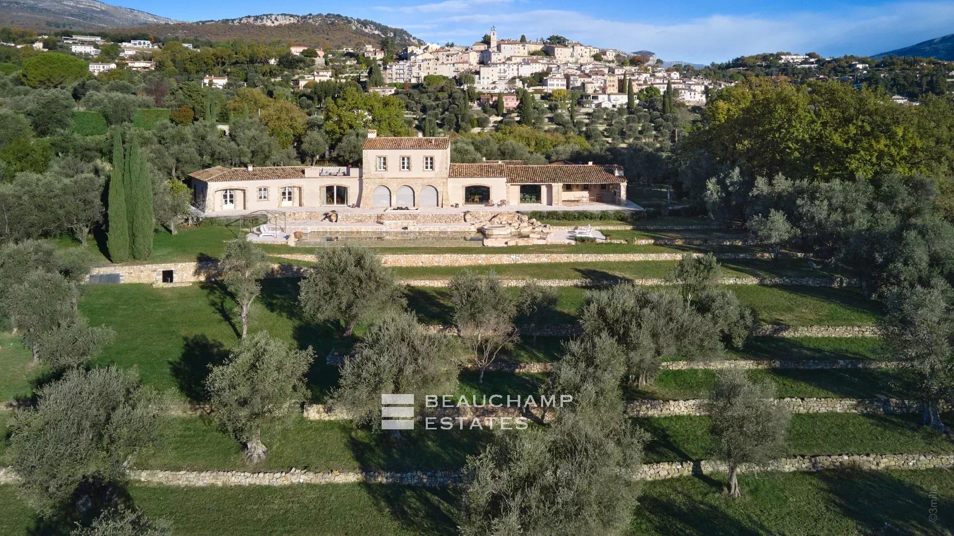 Située à 25 minutes de l'aéroport de Nice et de Cannes, cette bastide de prestige en pierre, exposée au sud, offre un cadre unique. Implantée sur un terrain de 10 000 m² entièrement clos de murs et richement paysagé avec 150 oliviers matures, elle présent...