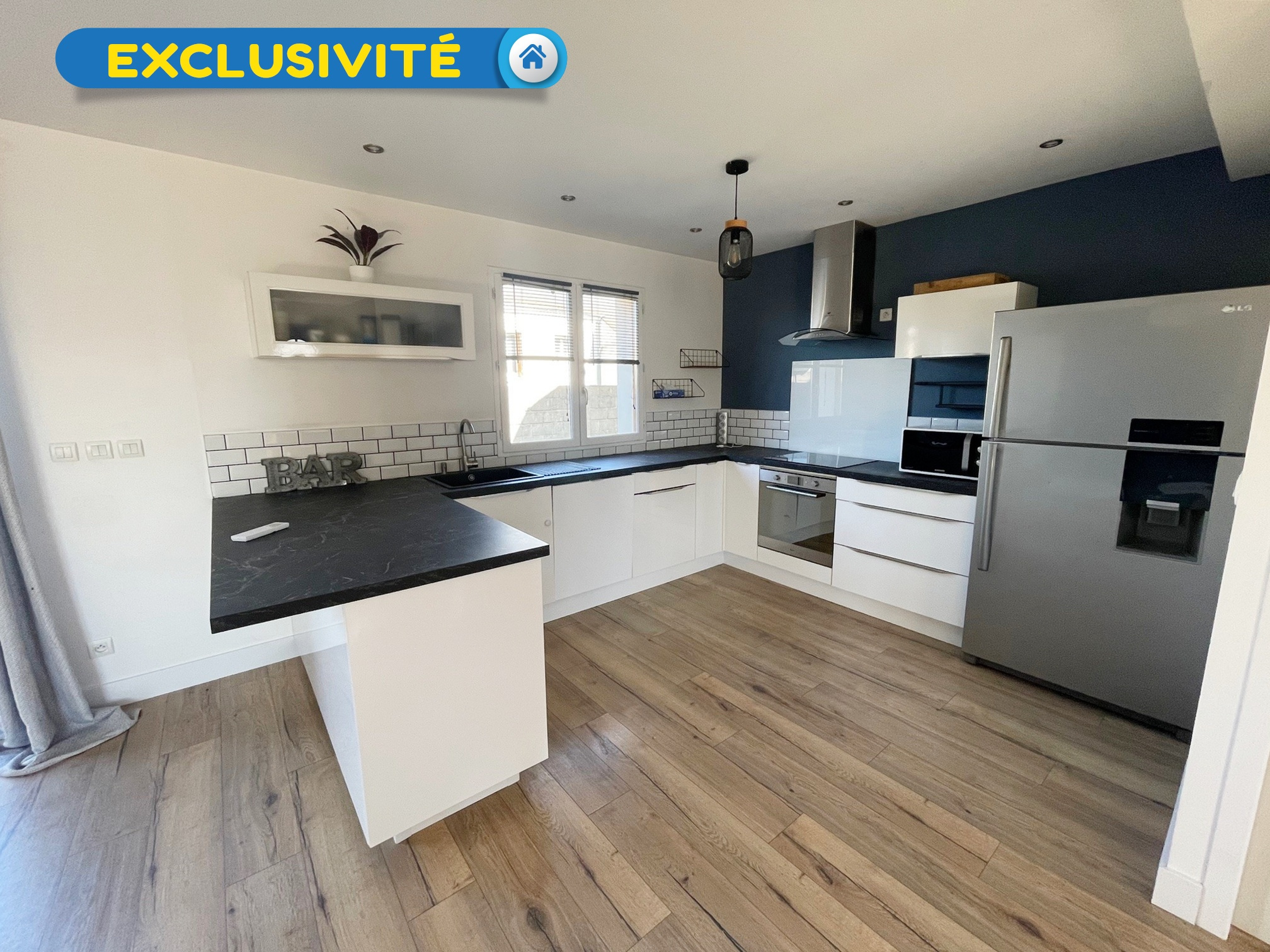 Exclusivité ! Maison rénovée, proches des commodités d'environ 106 m2 comprenant, au rez-de-chaussée, une grande pièce à vivre d'environ 52 m2 avec un séjour salon et une cuisine ouverte aménagée et équipée.