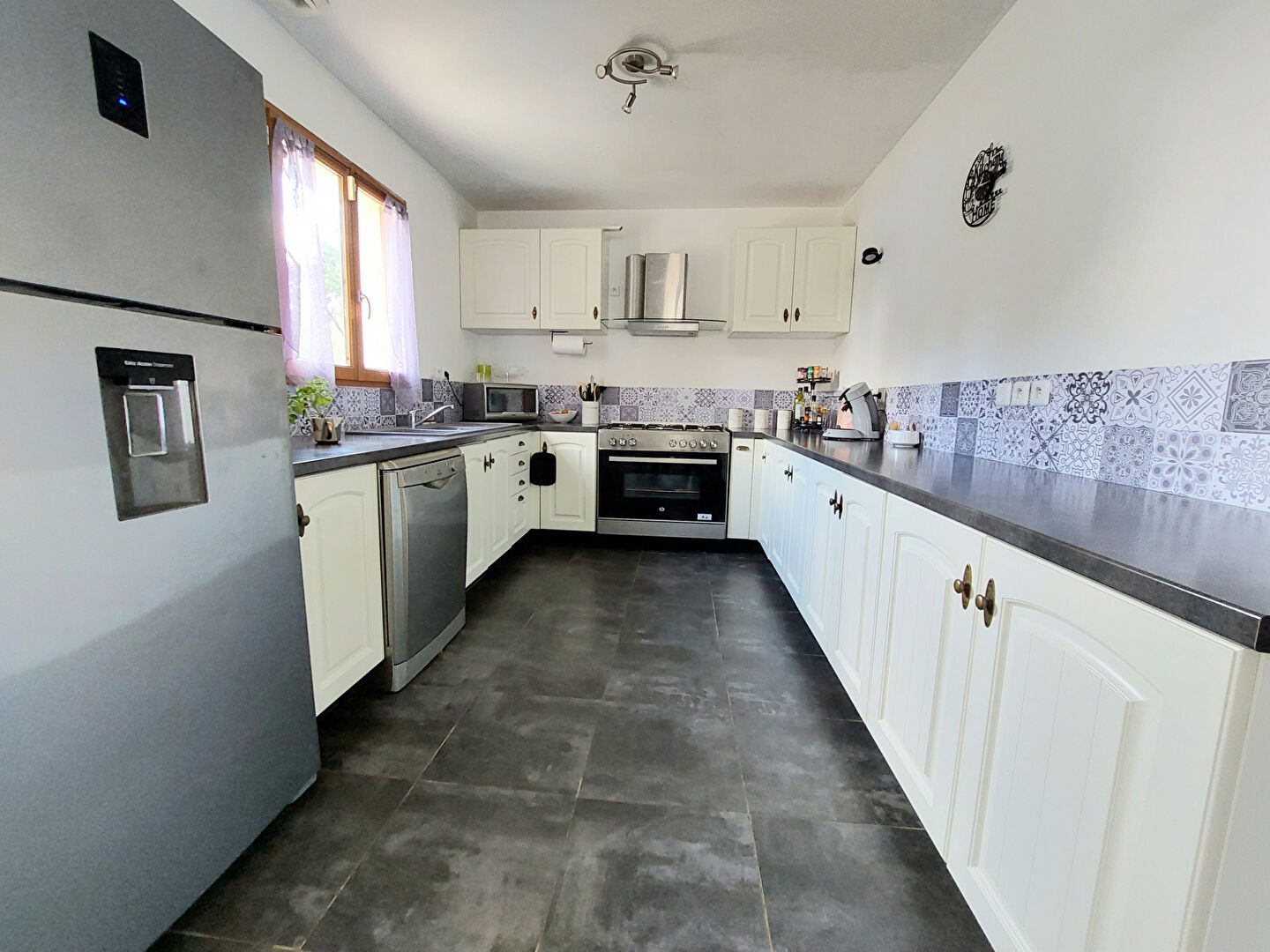 Entrée, cuisine équipée ouverte sur vaste espace de vie de 37 m² env avec cheminée insert, dégagement, 3 chambres, SDB, wc. Terrasse.