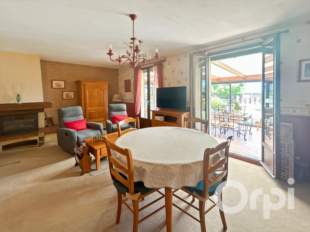 Entrée, cuisine équipée ouverte sur vaste espace de vie de 37 m² env avec cheminée insert, dégagement, 3 chambres, SDB, wc. Terrasse.