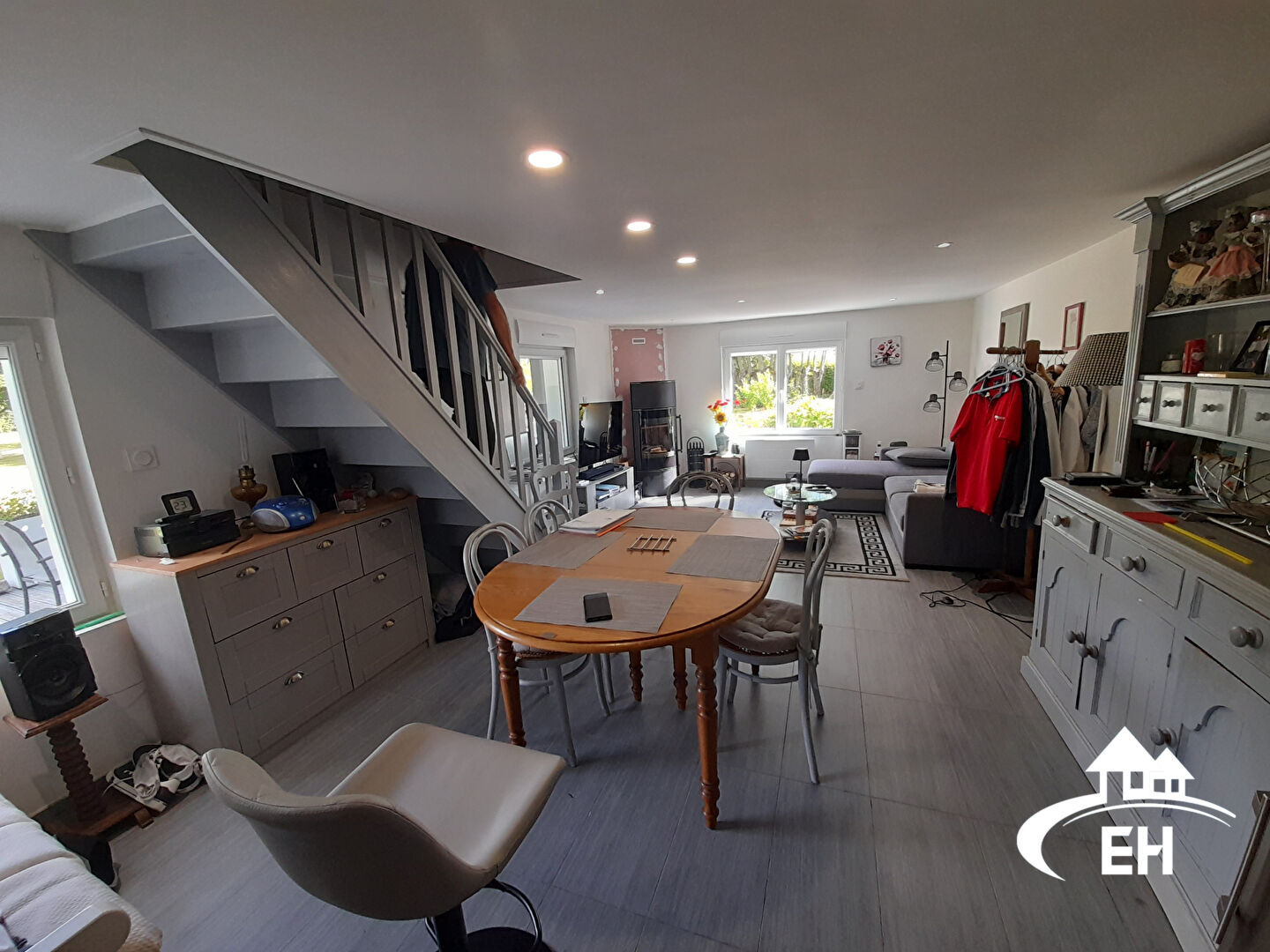 Entrée, séjour avec poêle à granulés ouvert sur coin cuisine aménagée équipée, salon avec cheminée, wc.