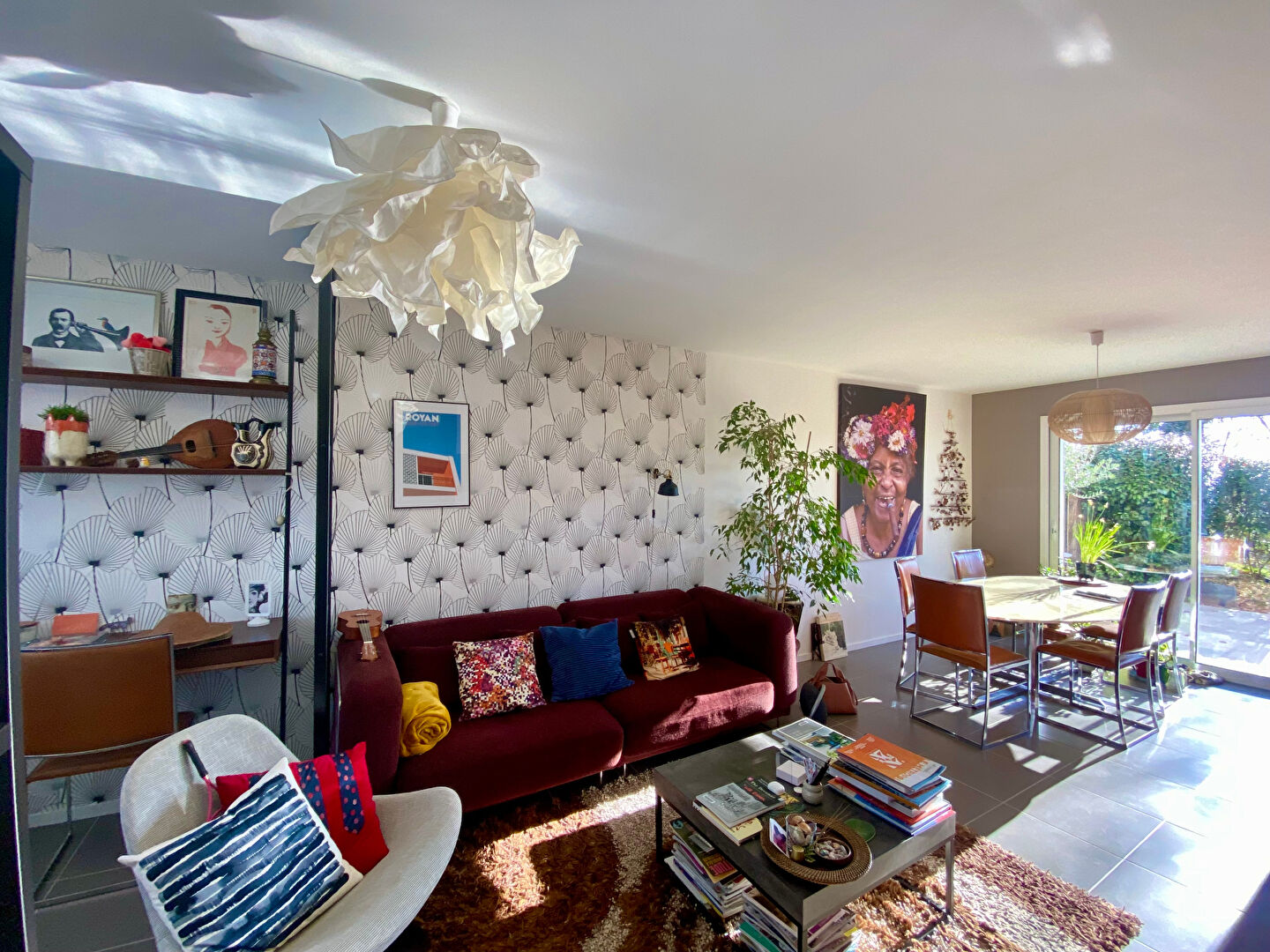 Un salon / séjour lumineux donnant sur une terrasse;