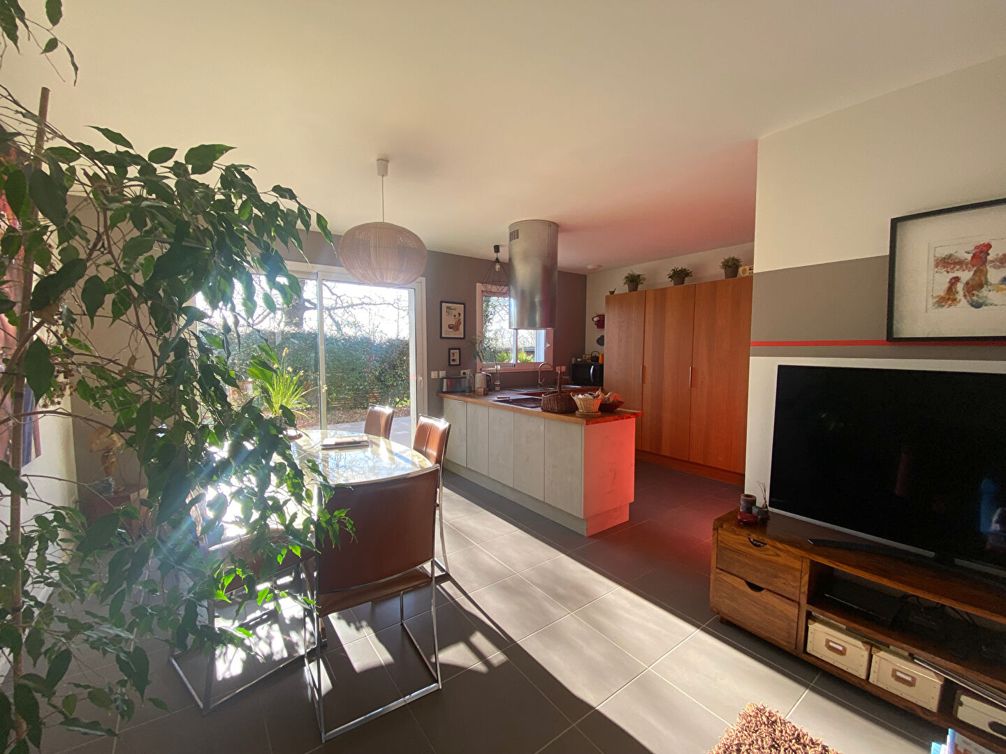 Pièce de vie avec cuisine ouverte équipée, donnant sur la terrasse et le jardin