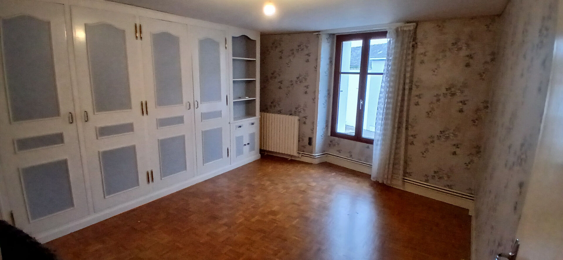 À l'étage : deux chambres à rénover avec parquet massif, accessible par un escalier en bois.