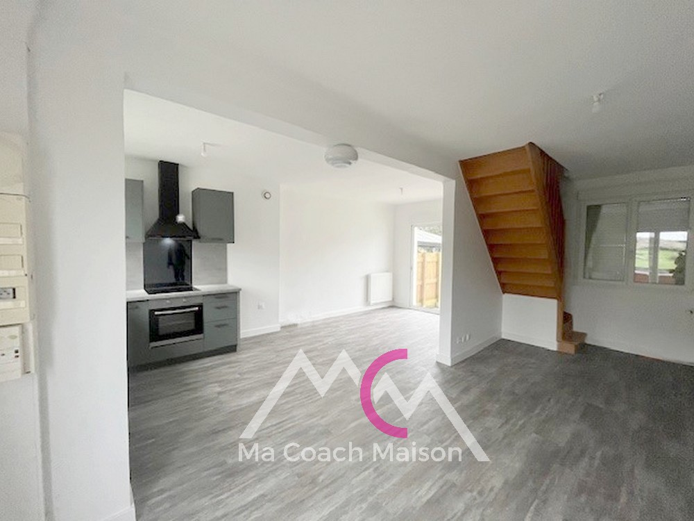 Maison de 3 chambres dans le bourg de Derval. cuisine ouverte sur le séjour, garage attenant à la maison, beau terrain de 575 m² arboré.