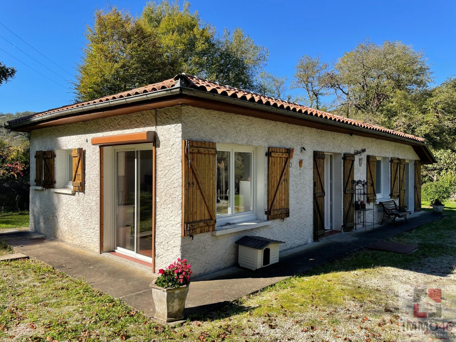 L'agence IMMO46 vous propose cette agréable maison de plain-pied, au calme dans un environnement verdoyant, située à quelques minutes de Puy-l'Évêque. <BR><BR><BR>La maison d'environ 100m² habitables vous offre un séjour avec c...