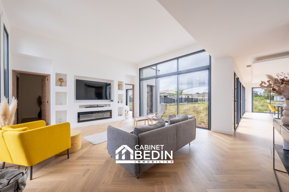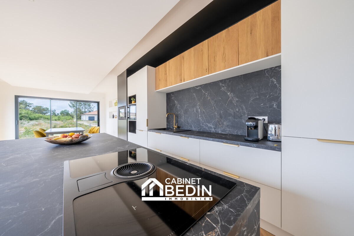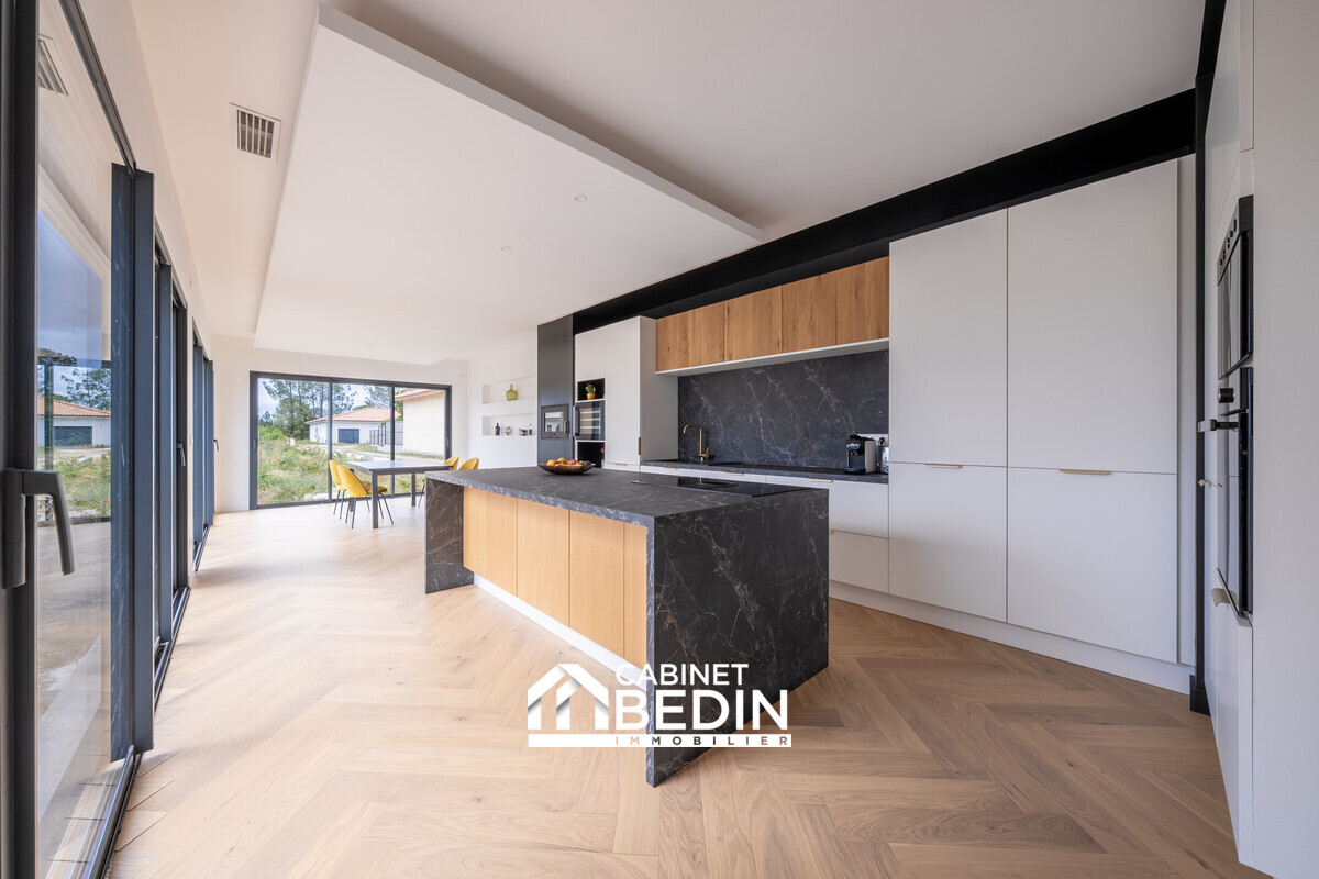 MACAU. Belle maison contemporaine de 2024, lumineuse et fonctionnelle. Elle offre un hall d'entrée avec placard, un vaste séjour de 66m2 avec cuisine ouverte et salon baigné de lumière grâce aux grandes baies vitrées. Vous apprécierez le grand cellier att...