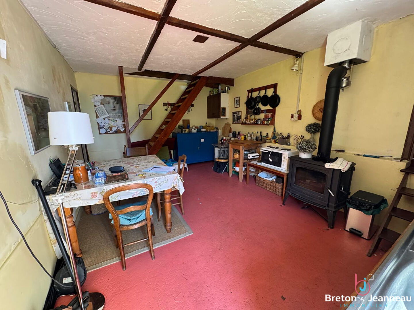 Au rez-de-chaussée : une cuisine chaleureuse avec poêle à bois, un salo...