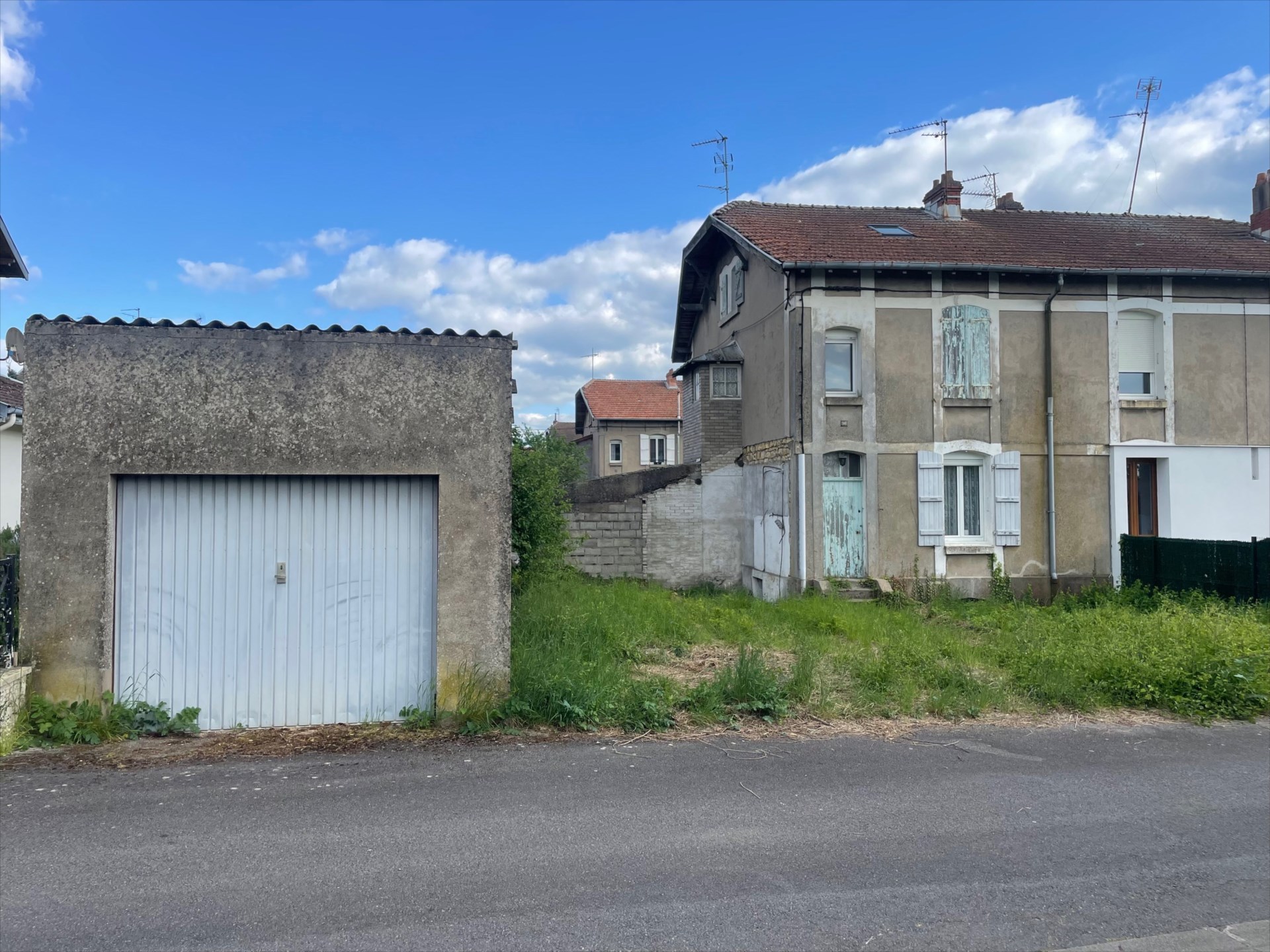 MAISON mitoyenne à conforter composée d'une cuisine semi équipée-salon-salle d'eau (douche,wc) Etage : deux chambres-wc-combles au-dessus-cave-garage -terrasse et terrain 2a56 env. dépendance - (chauffage central GAZ-dble ...