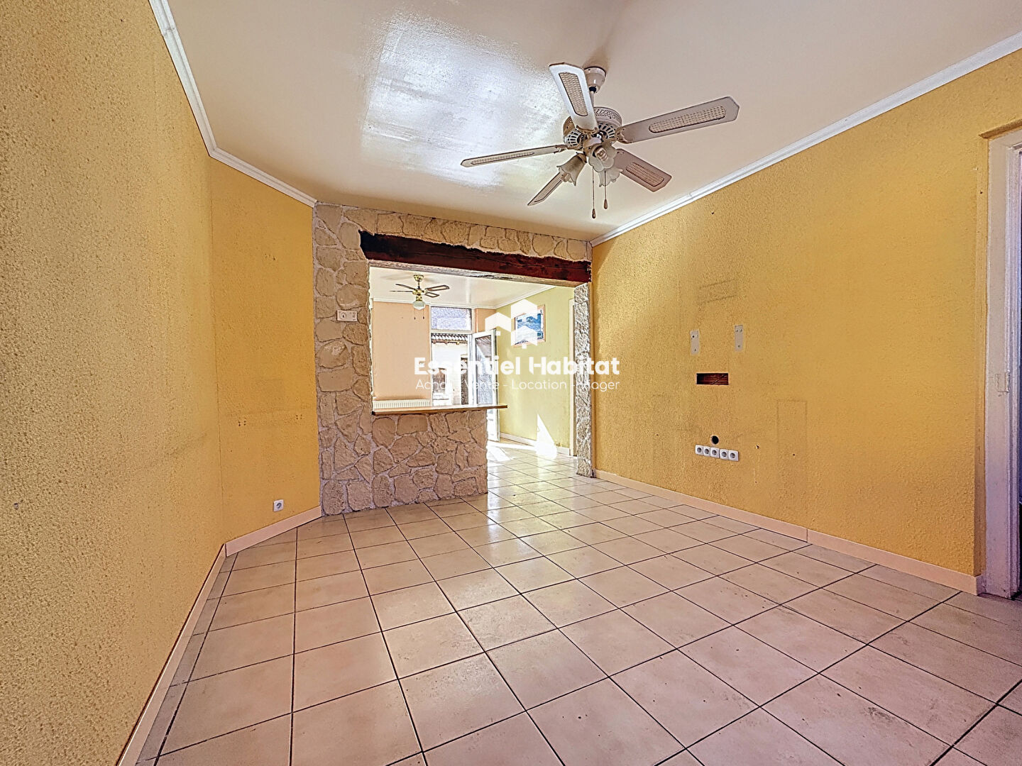 Grande entrée desservant cuisine et pièce de vie avec une belle hauteur, salle d'eau avec wc, accès cave.