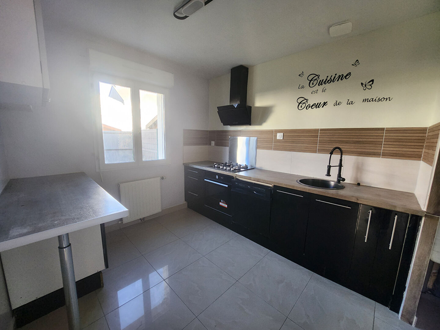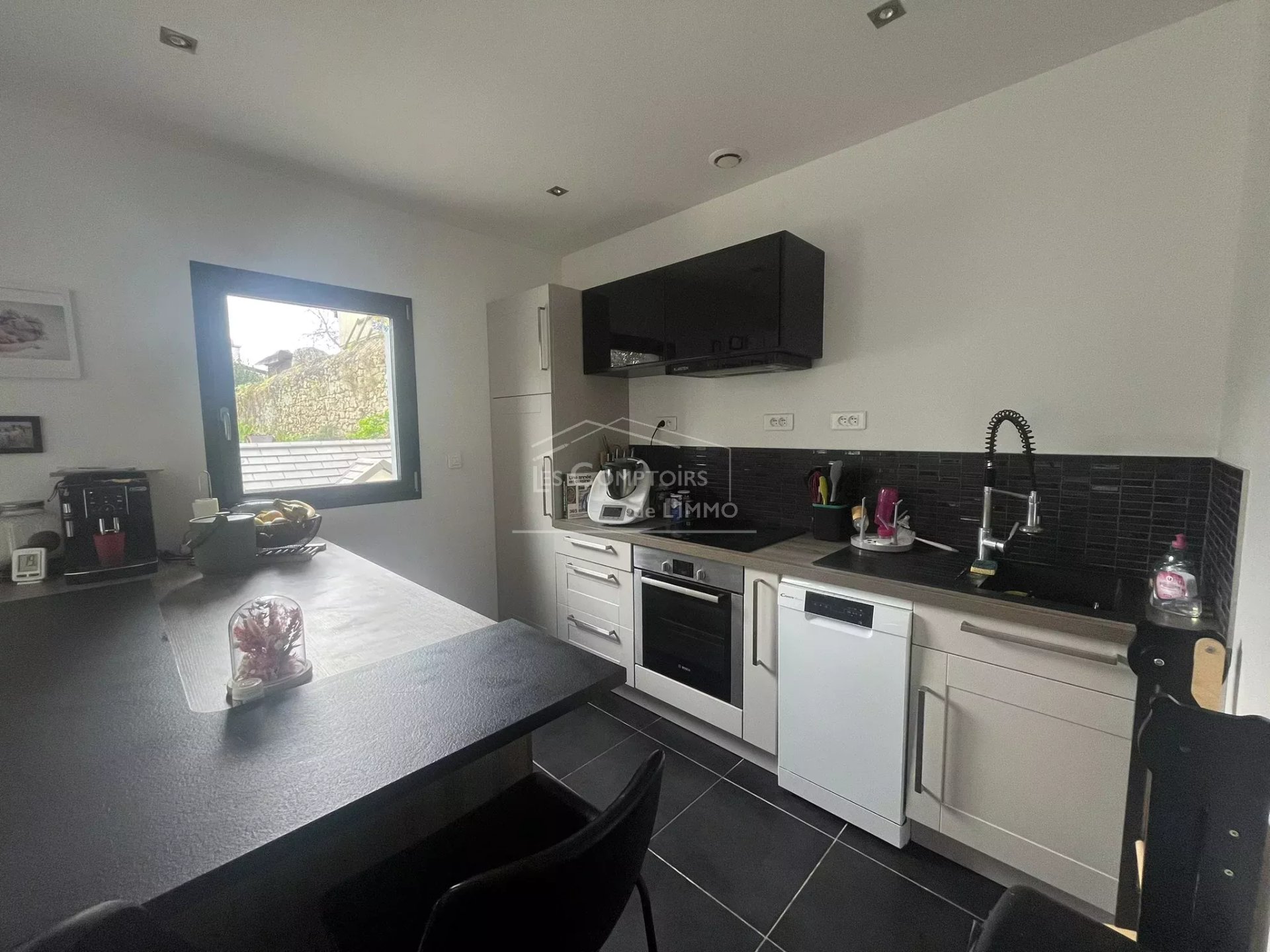 Au RDC : entrée, pièce de vie avec cuisine A/E (plaque, hotte, four, lave-vaisselle, frigo), WC, buanderie, chambre.