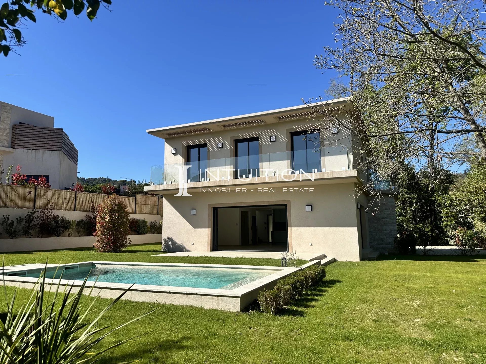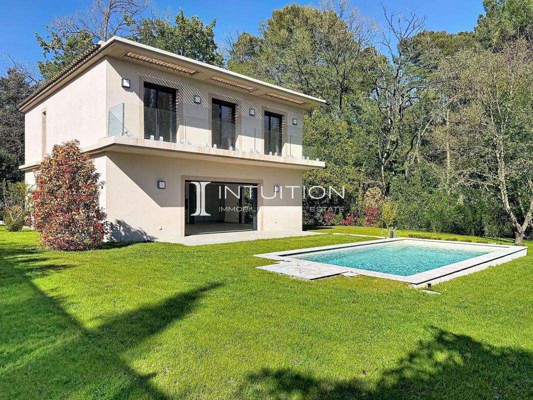 Set within a landscaped park featuring century-old restanques, this brand-new 141 m² contemporary villa embodies discreet luxury in Mougins.