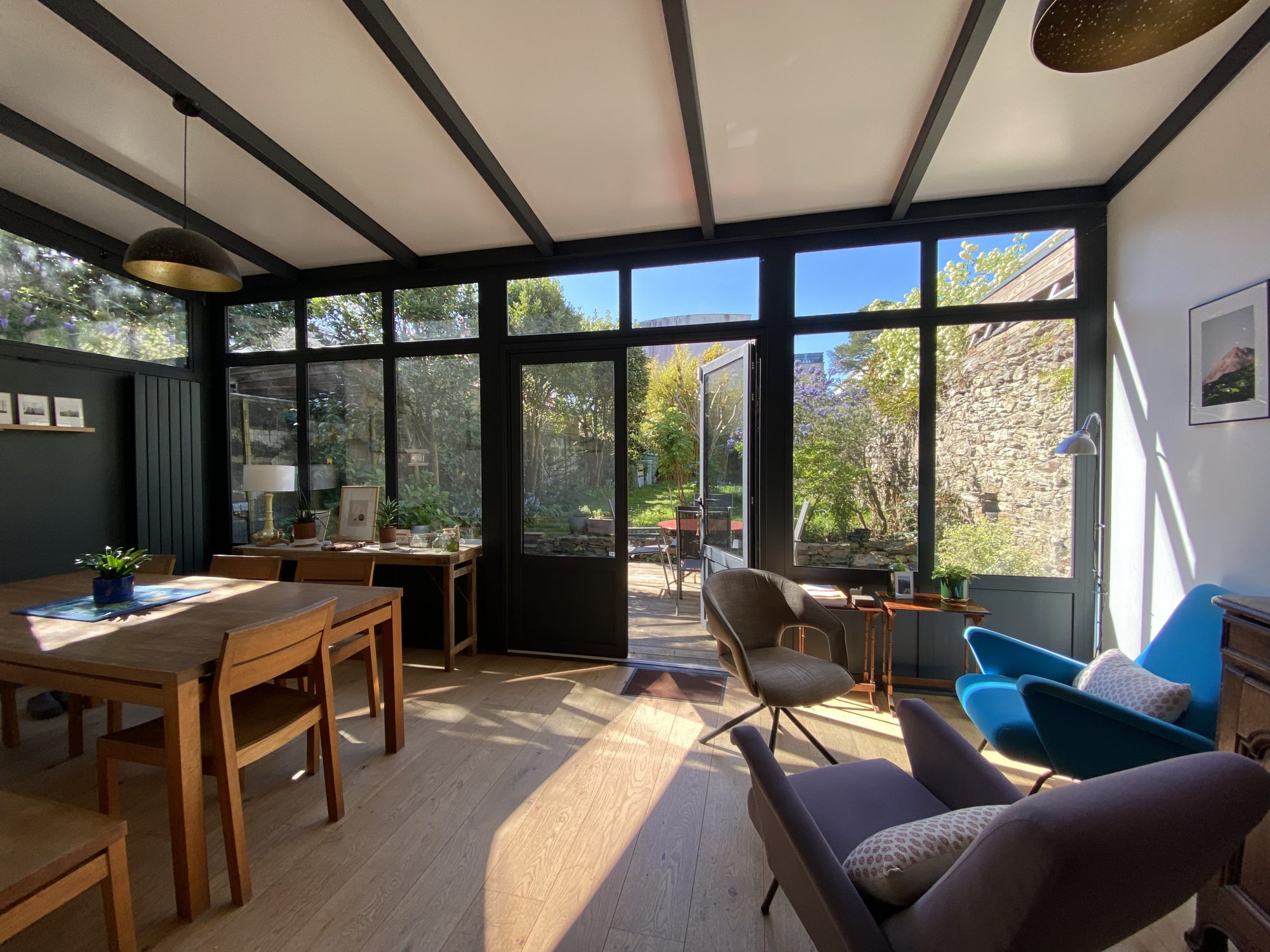 Maison 1900 entièrement rénovée à la charmante façade côté jardin soulignée par une élégante verrière contemporaine.