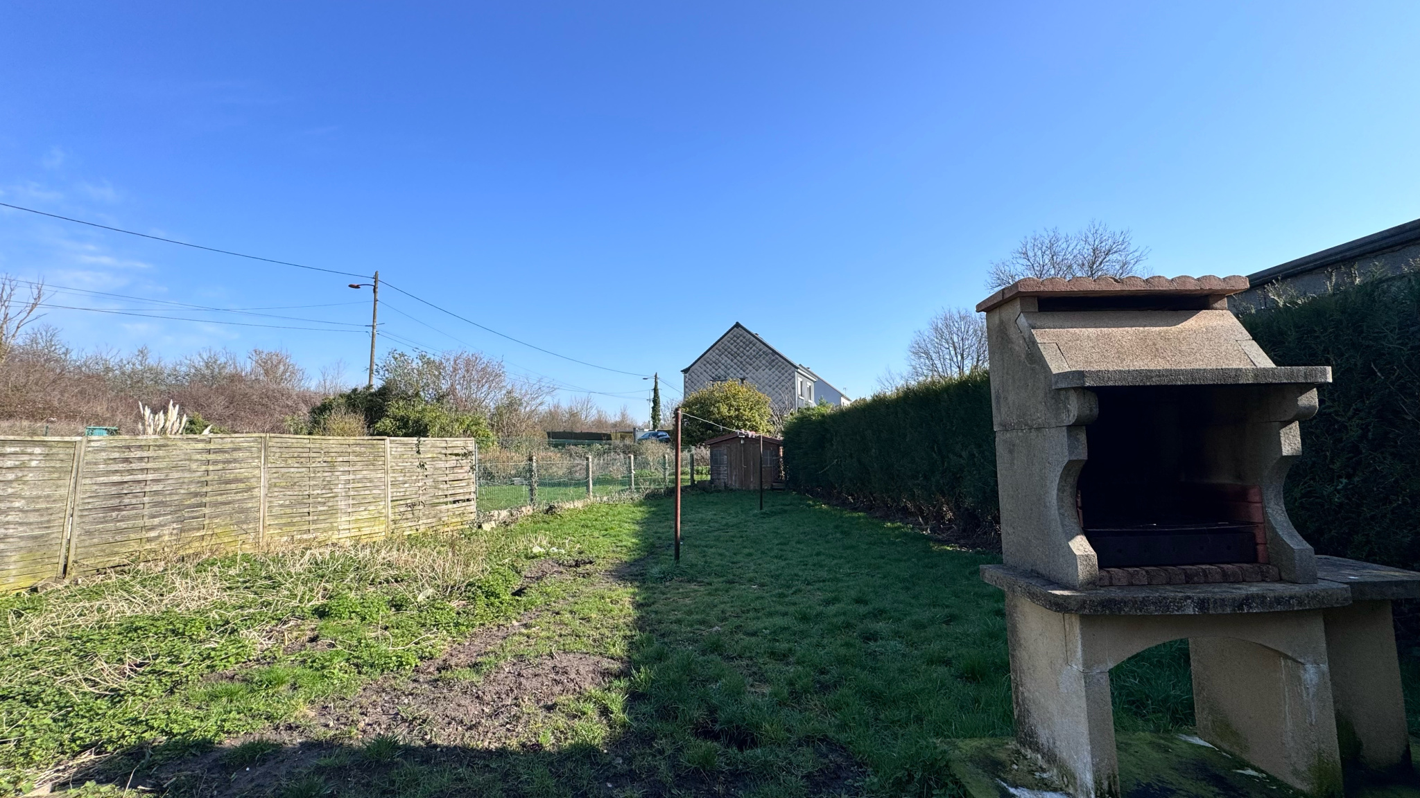 Maison mitoyenne comprenant salon séjour avec charmante cheminée à insert, grande cuisine ouverte aménagée équipée, acces terrasse donnant sur un vaste jardin arboré avec chalet.