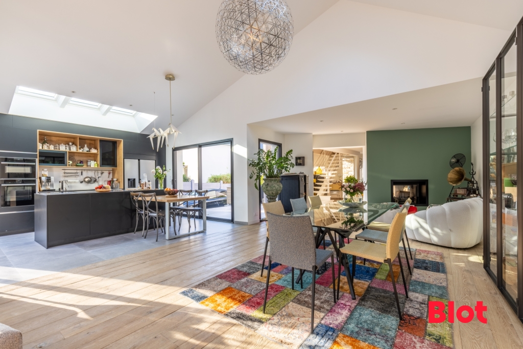 D'une surface habitable de 364 m2, les volumes des trois pièces de vie donnant de plai...
